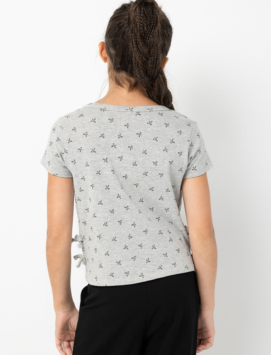 Un t-shirt féminin rehaussé d’un motif délicat et de jolis nœuds latéraux, pour allier charme et originalité.