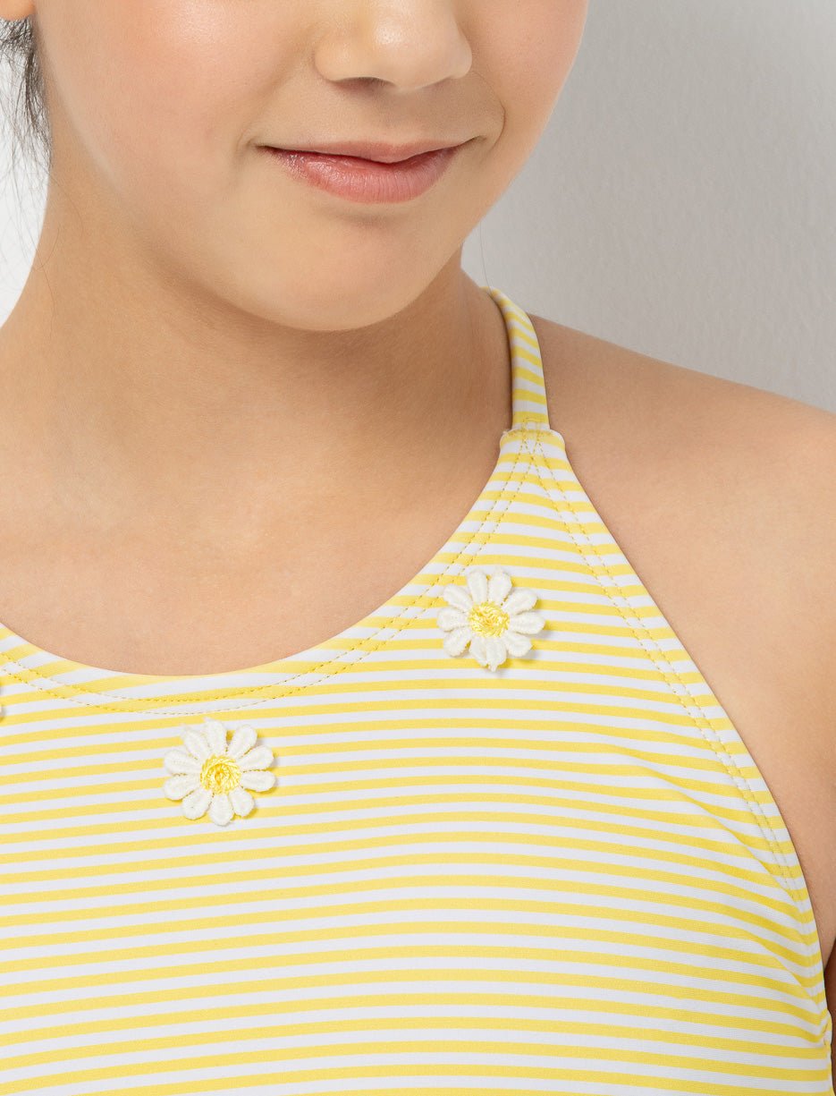Ce maillot 2 pièces au col haut est parfait pour les journées d’été actives. Ses bretelles croisées et nouées au dos assurent confort et maintien, tandis que les détails plissés sur le bas ajoutent une touche mignonne et stylée.