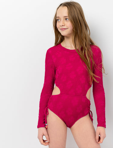 Maillot 1 pièce à dermoprotecteur avec col rond et ouvertures sur les côtés. Les cordons ornés de billes aux hanches ajoutent une touche stylée, parfait pour bouger librement à la plage ou à la piscine.