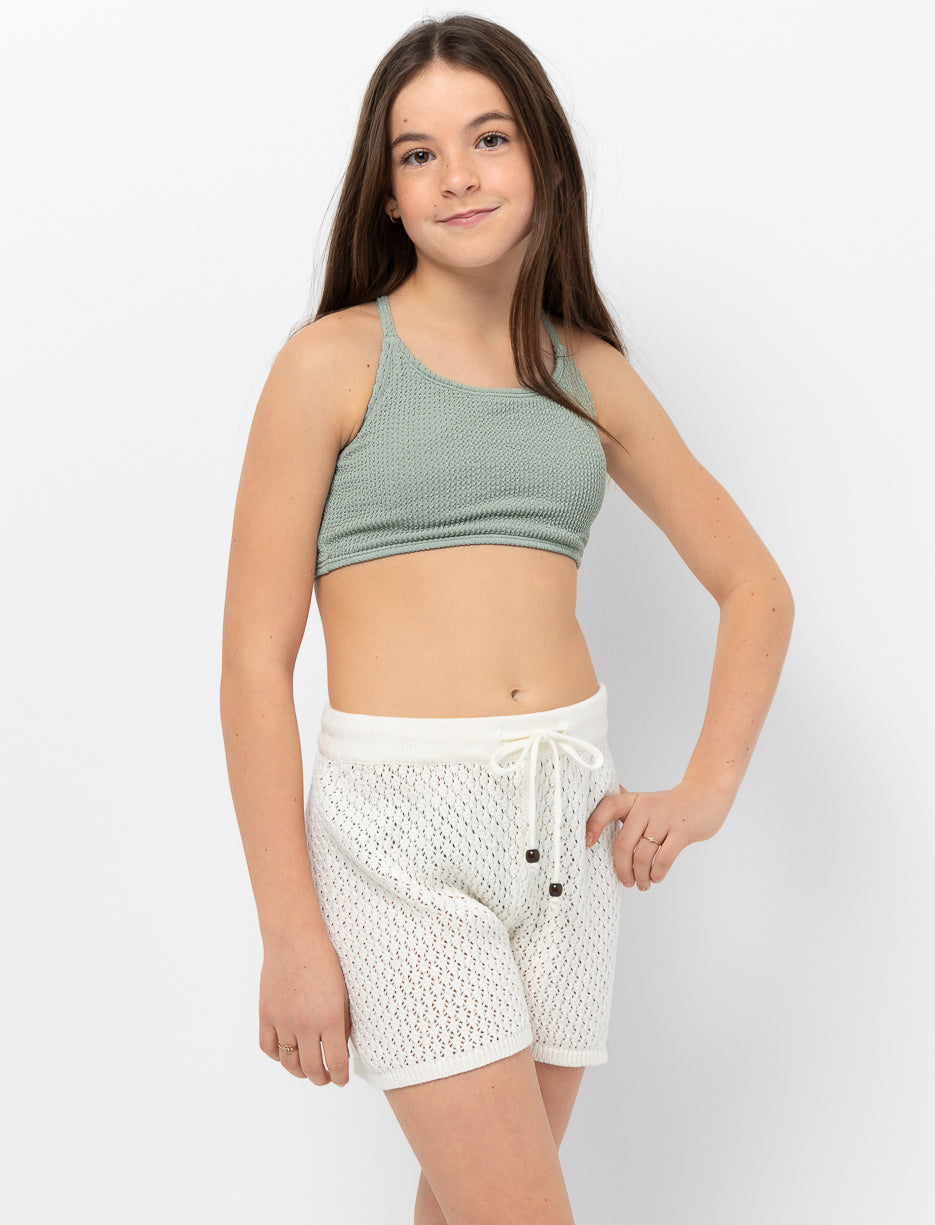 Ce short en crochet est parfait à enfiler par-dessus un maillot. Sa taille élastique avec cordons ajoute une touche décontractée, idéale pour la plage ou les moments détente au soleil.