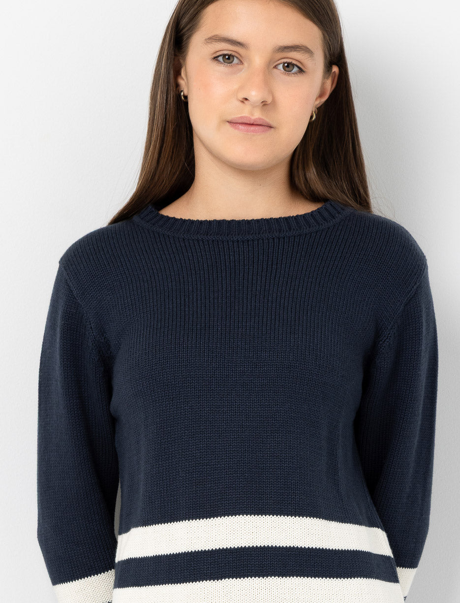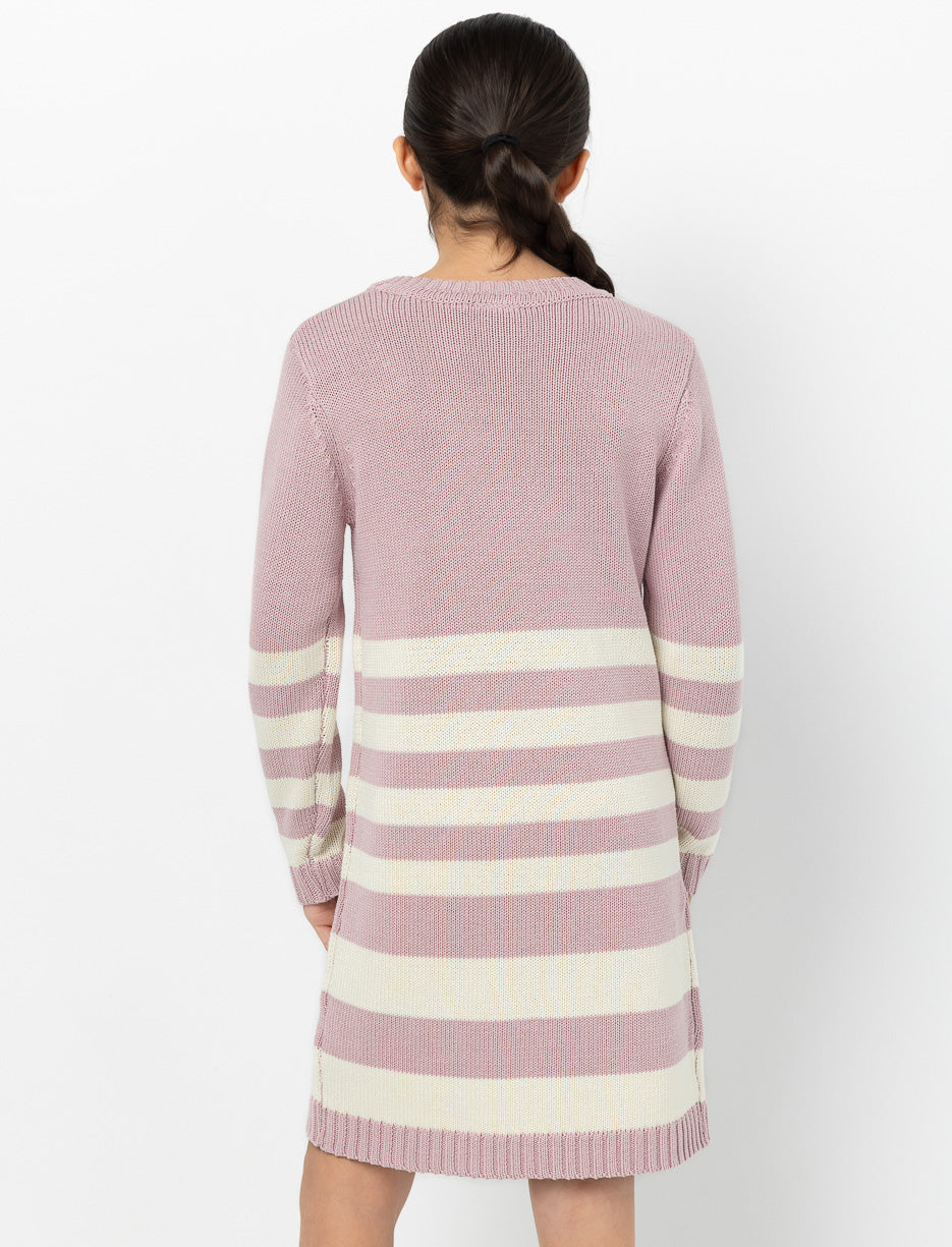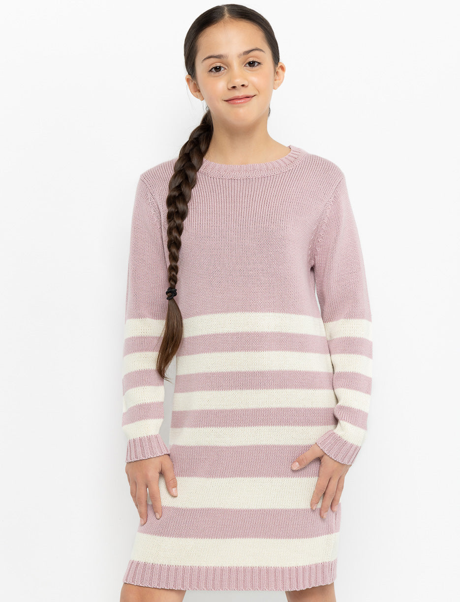 Robe longue en tricot à rayures, parfaite pour garder votre fille bien au chaud avec style. Son col rond et ses poignets côtelés ajoutent une touche classique à ce modèle confortable et tendance.