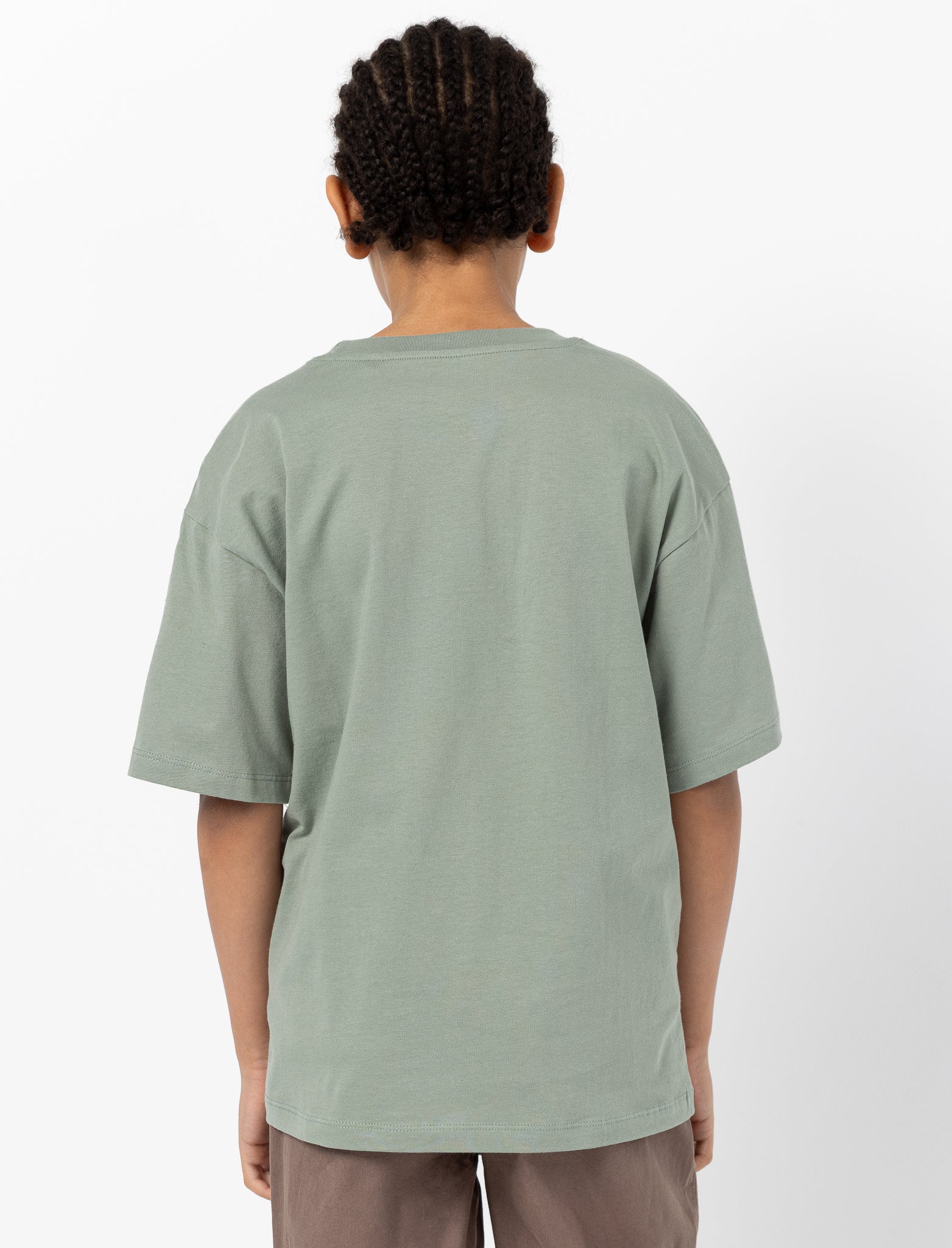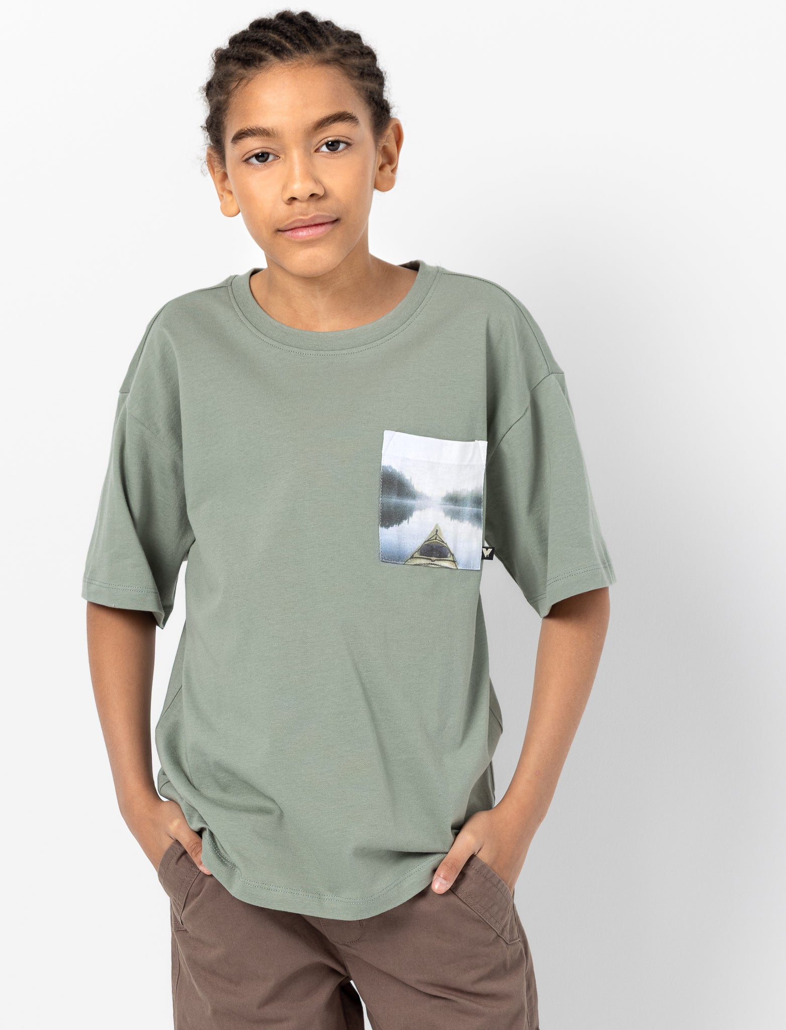 T-shirt uni avec poche imprimée contrastante, manches courtes et épaules tombantes, offrant un style décontracté et confortable.