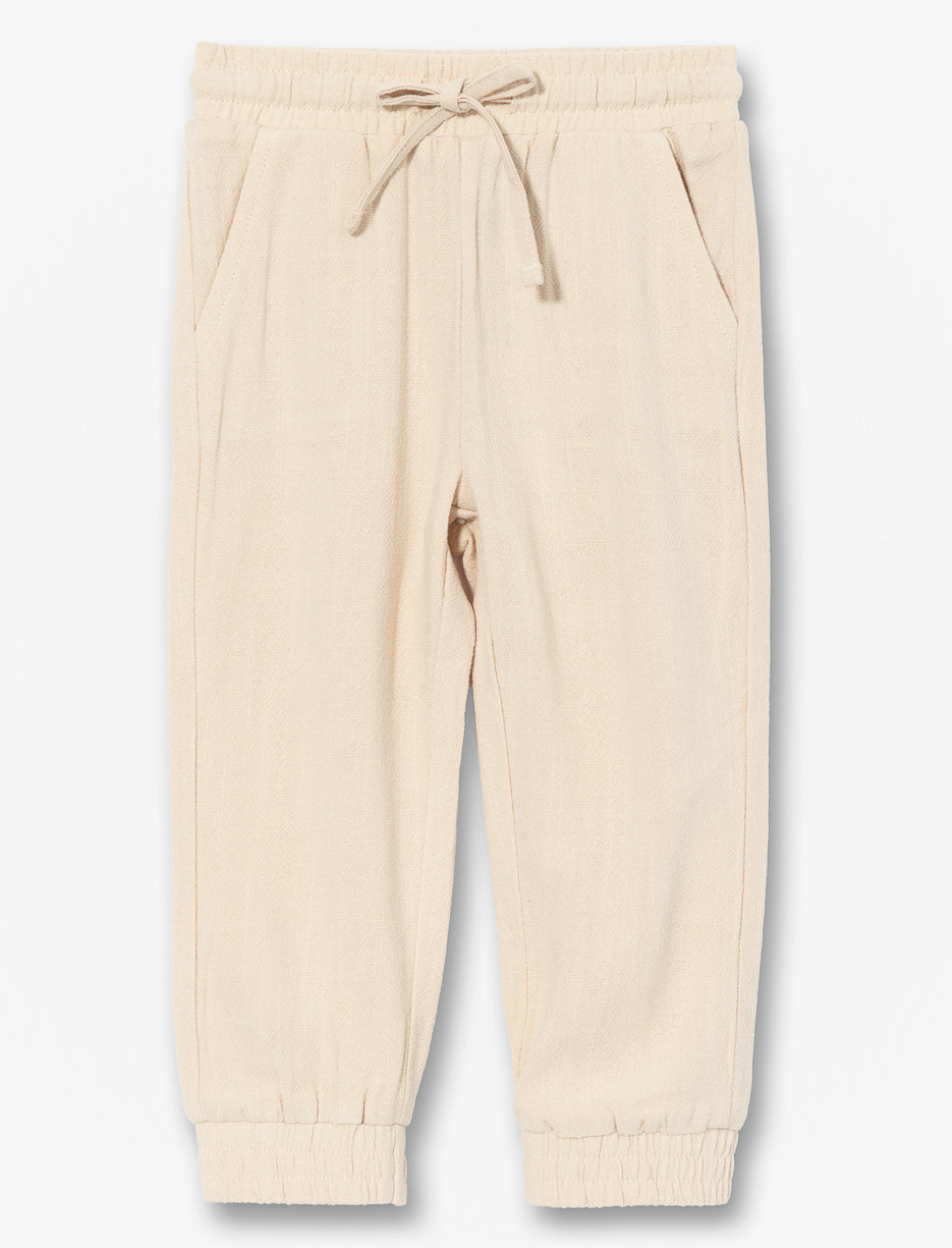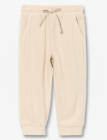 Pantalon jogger confortable pour bébé fille en lin. Taille élastique avec cordon ajustable, 2 poches latérales pratiques et élastique aux chevilles. Parfait pour les jours chauds, doux et respirant.