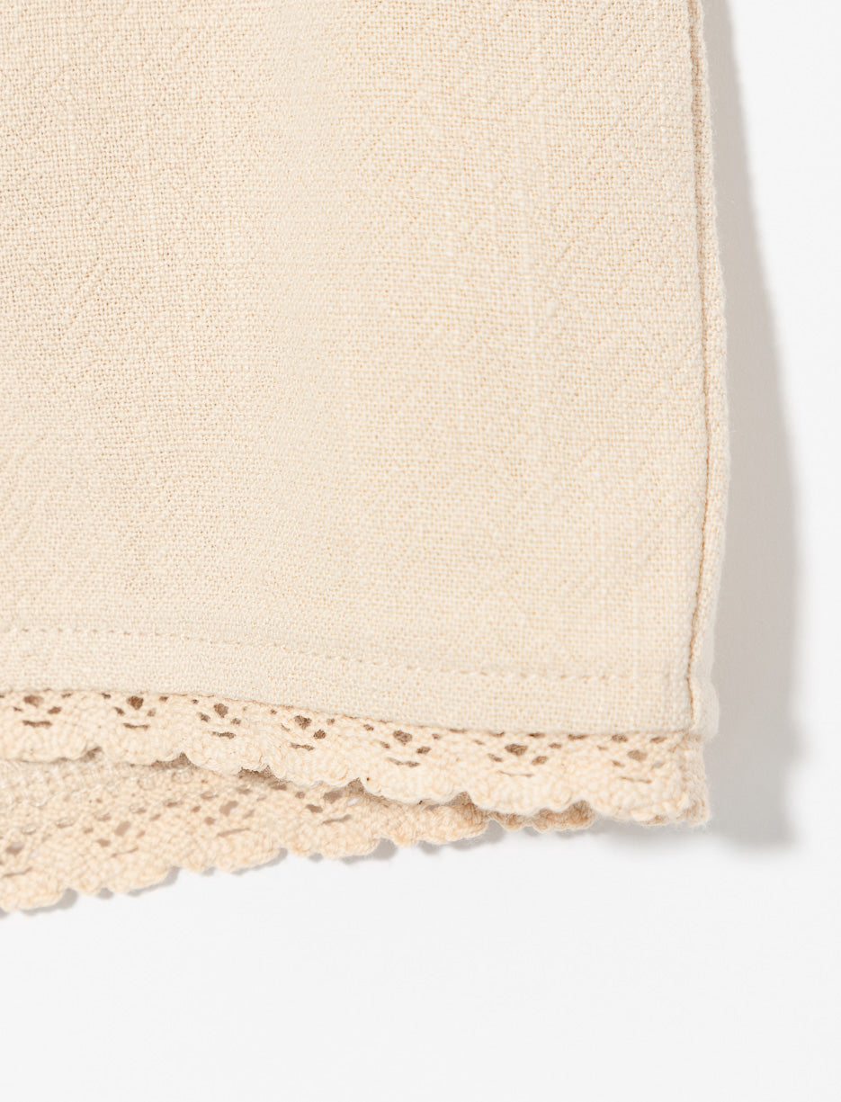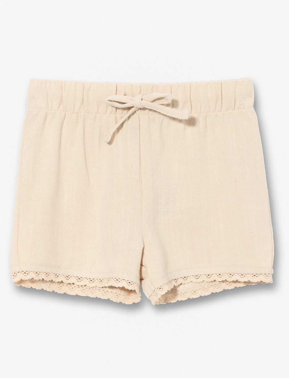 Short en lin pour bébé fille avec taille élastique et cordon de serrage. Détails délicats en dentelle aux cuisses pour un style doux et confortable.
