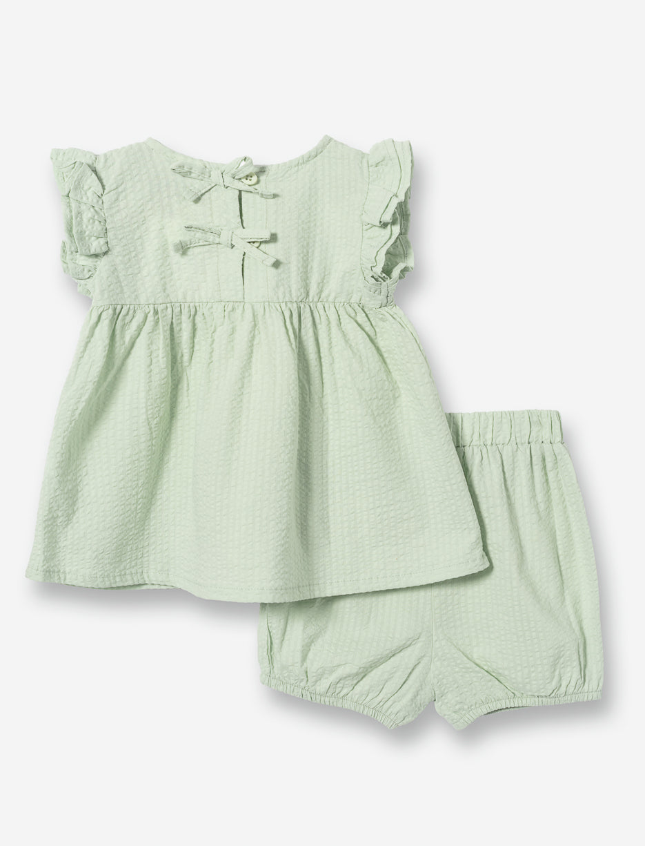 Ensemble deux pièces adorable. Le haut à col rond arbore des manches courtes avec jolis volants et une découpe flatteuse sous la poitrine, agrémenté d'un imprimé floral coloré sur tissu plissé. Le bas confortable offre une taille élastiquée et des ouvertures de jambe pratiques. Un ensemble parfait pour que ta petite princesse soit à la fois mignonne et à l'aise toute la journée!