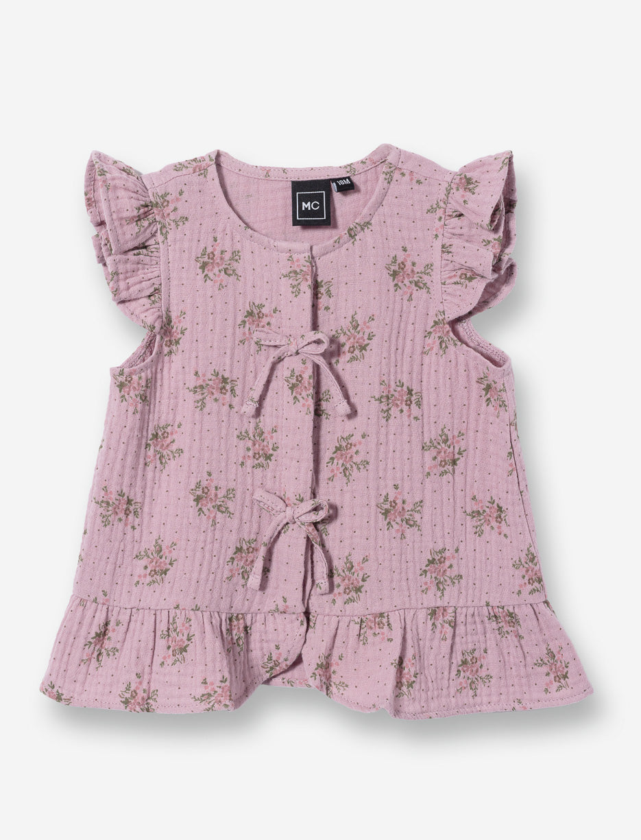 Veste sans manches adorable pour bébé fille. Dotée d'un col rond et d'un volant qui ajoute une touche de féminité. Fermeture par boutons cachés avec boucle pratique au devant. Motif charmant sur toute la surface. Parfaite pour les journées fraîches, elle se superpose facilement sur les vêtements de tous les jours.