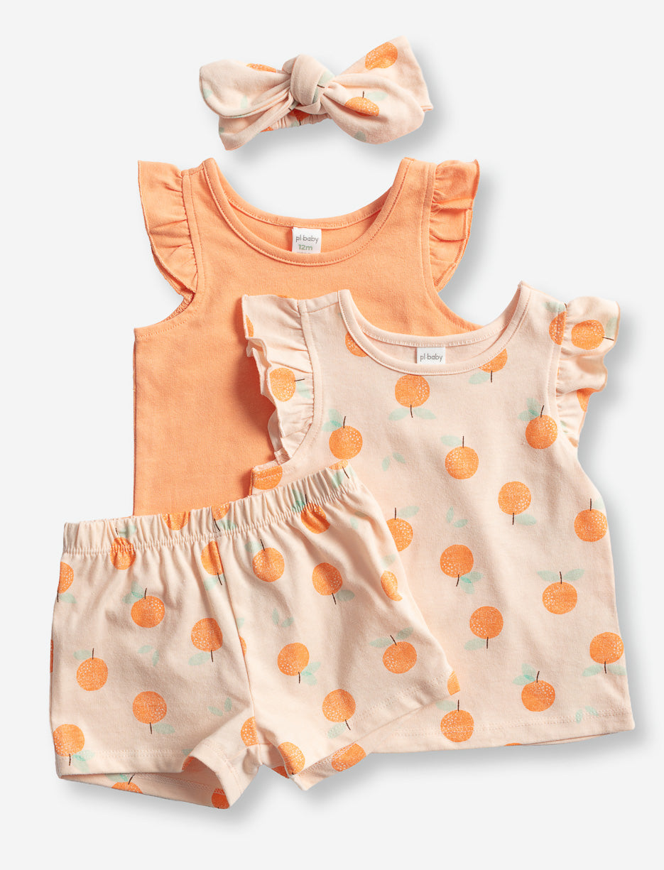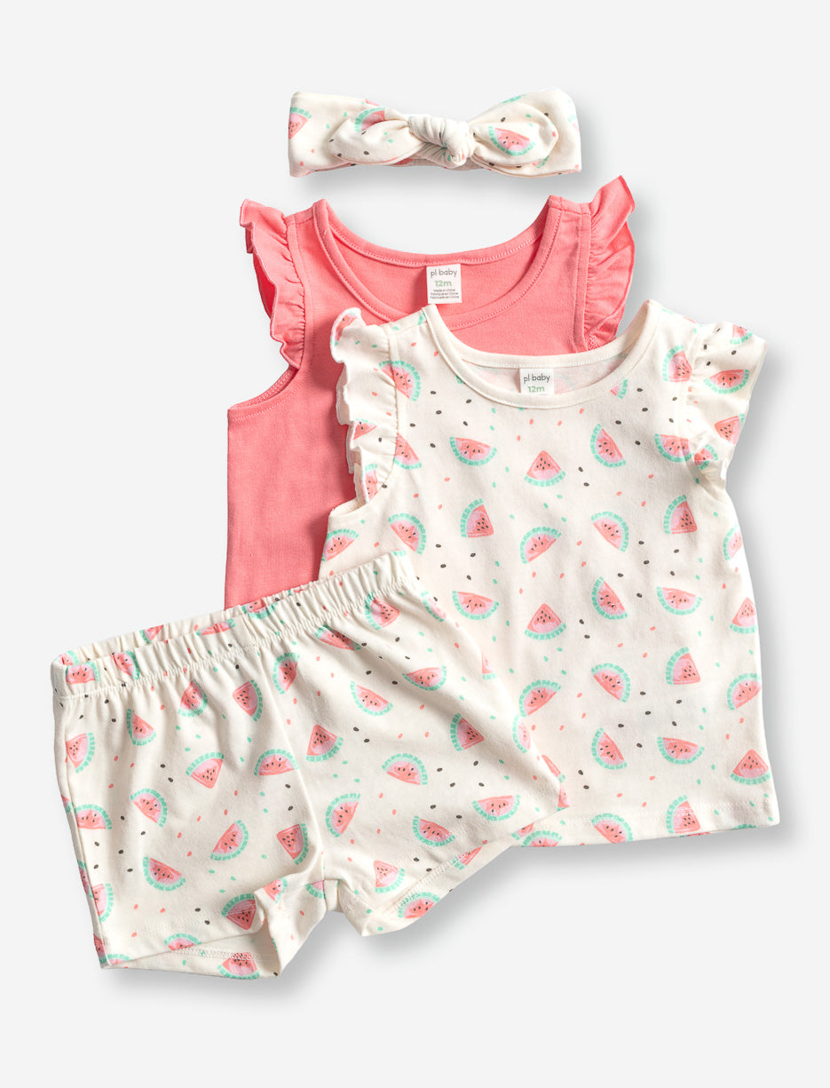 Ensemble 3 pièces pour bébé fille comprenant un t-shirt, une camisole et un short, accompagné d’un bandeau assorti. Les couleurs et motifs coordonnés créent un ensemble harmonieux et adorable, parfait pour les journées ensoleillées.