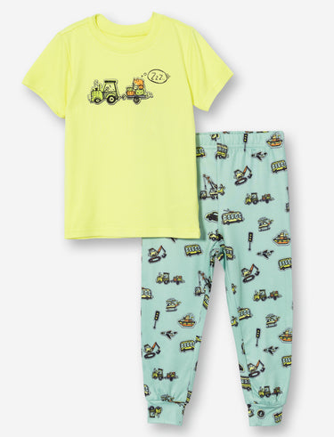 Ensemble pyjama 2 pièces confortable et amusant. T-shirt à col rond avec snap et manches courtes, orné d'un motif camion all-over. Pantalon à taille élastique avec côtes aux chevilles. Parfait pour les nuits douces et les jours de détente.