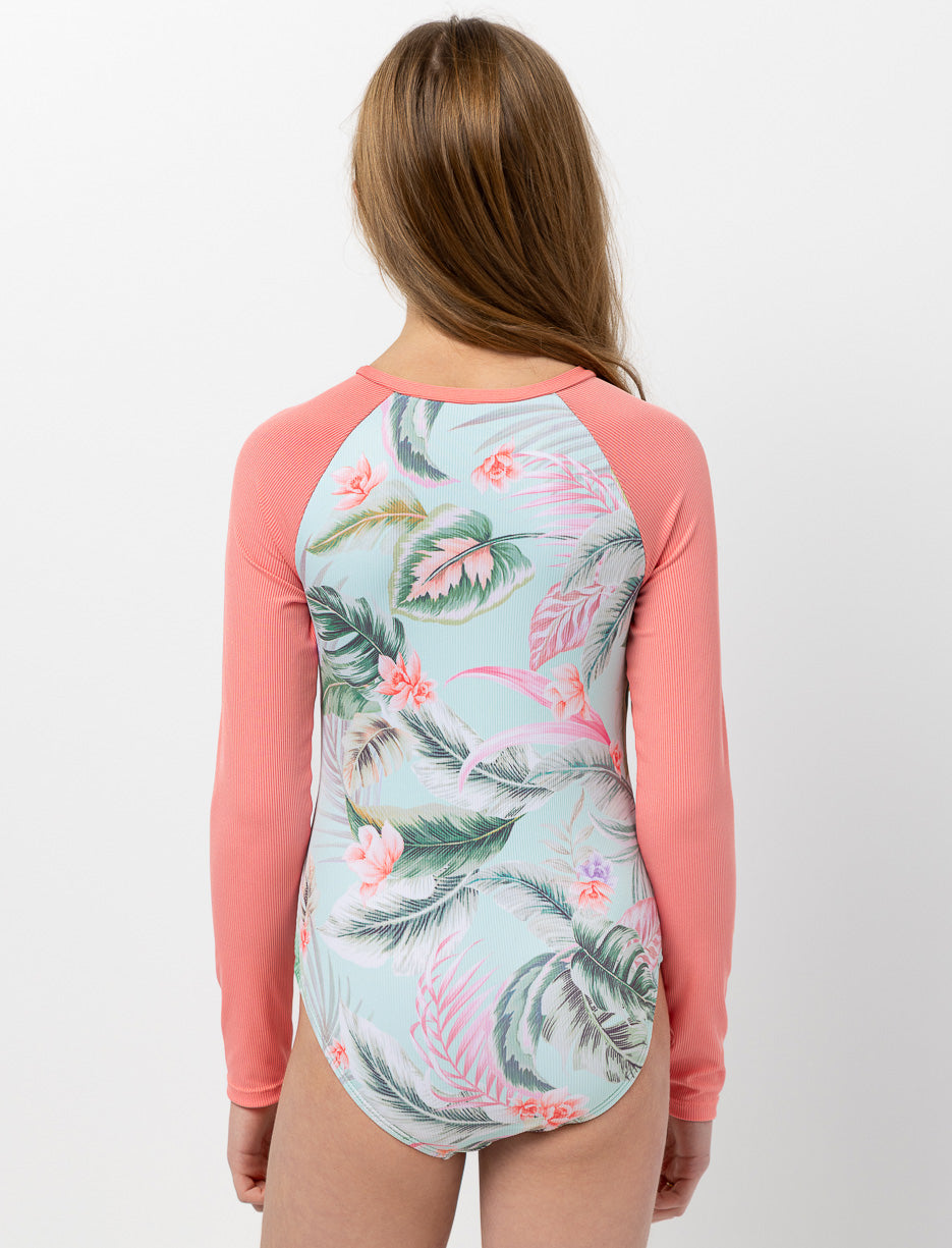 Idéal pour les journées au soleil, ce maillot 1 pièce offre une protection UV 50, un demi-zip pratique et un imprimé tropical éclatant. Ses manches raglan assurent confort et liberté dans toutes ses activités.