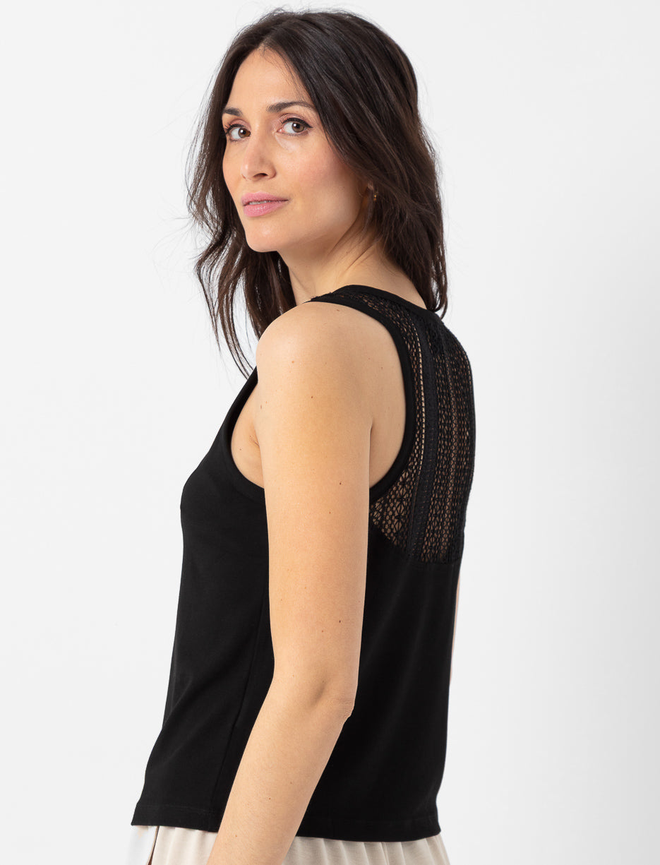 Simplicité devant, surprise derrière! Cette camisole ajoute une touche de raffinement avec son détail crocheté, pour une tenue à la fois chic et décontracté.