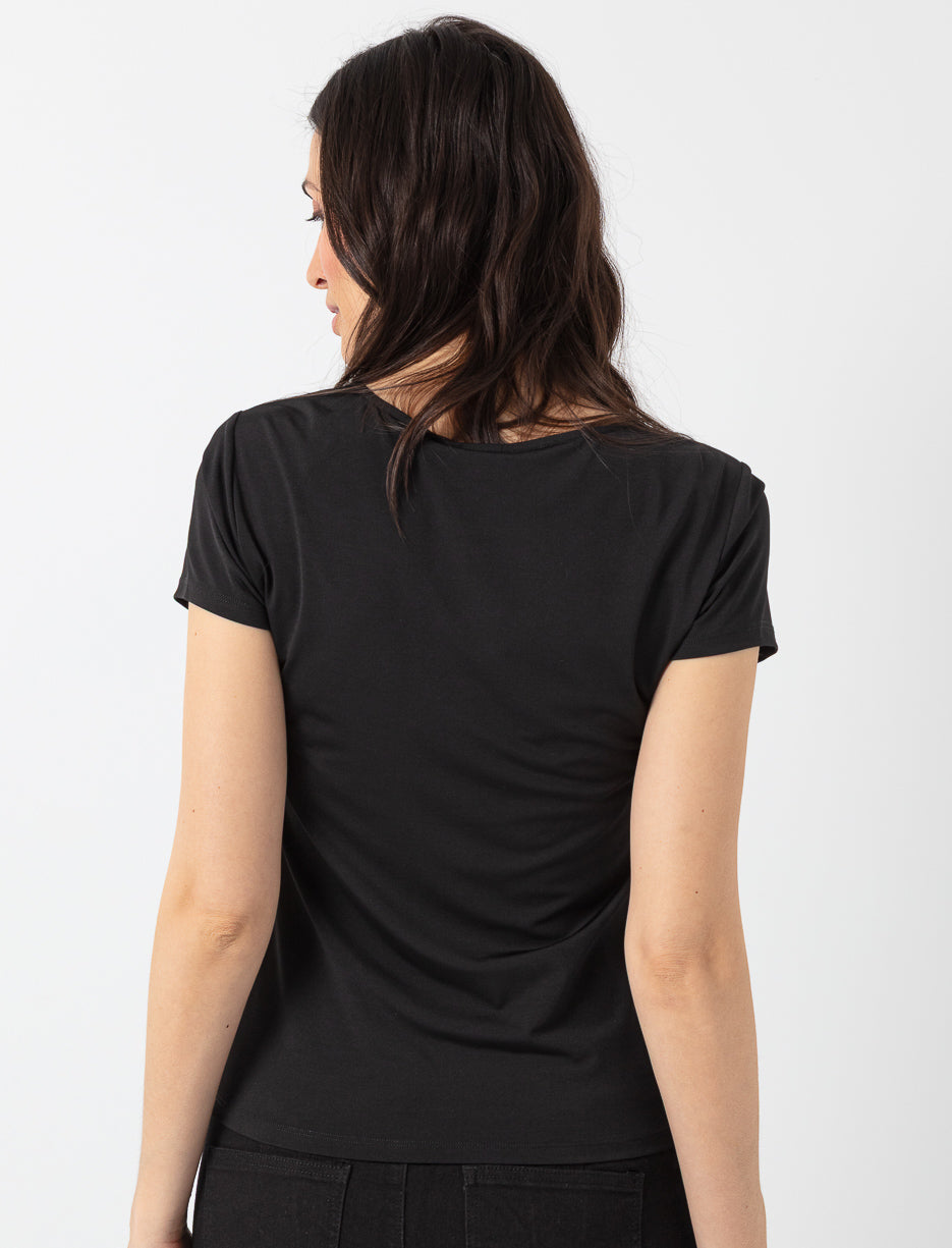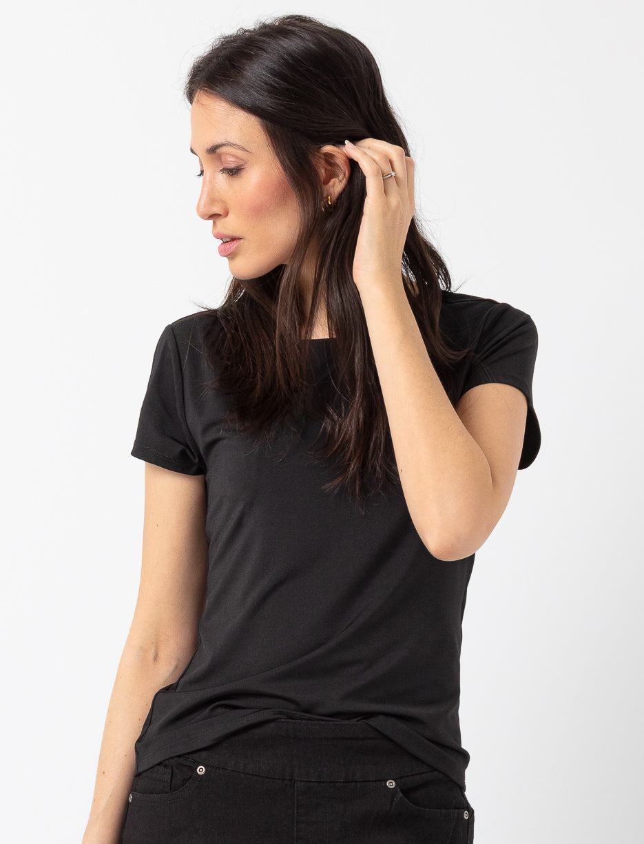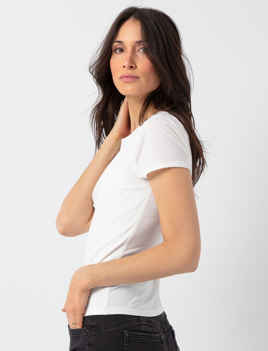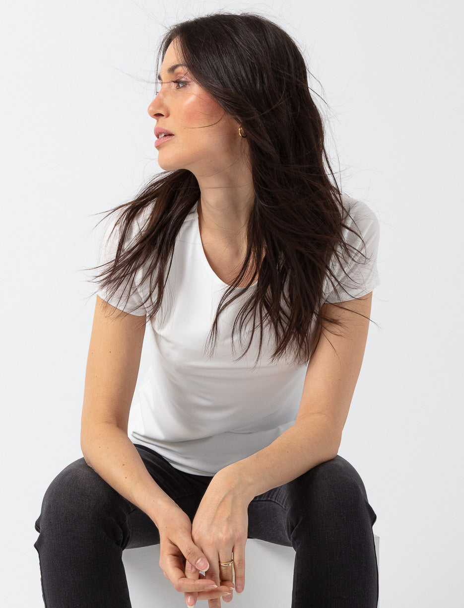 Un essentiel polyvalent au confort absolu. Ce t-shirt ajusté épouse la silhouette tout en douceur et s’agence avec tout, du jean au veston.