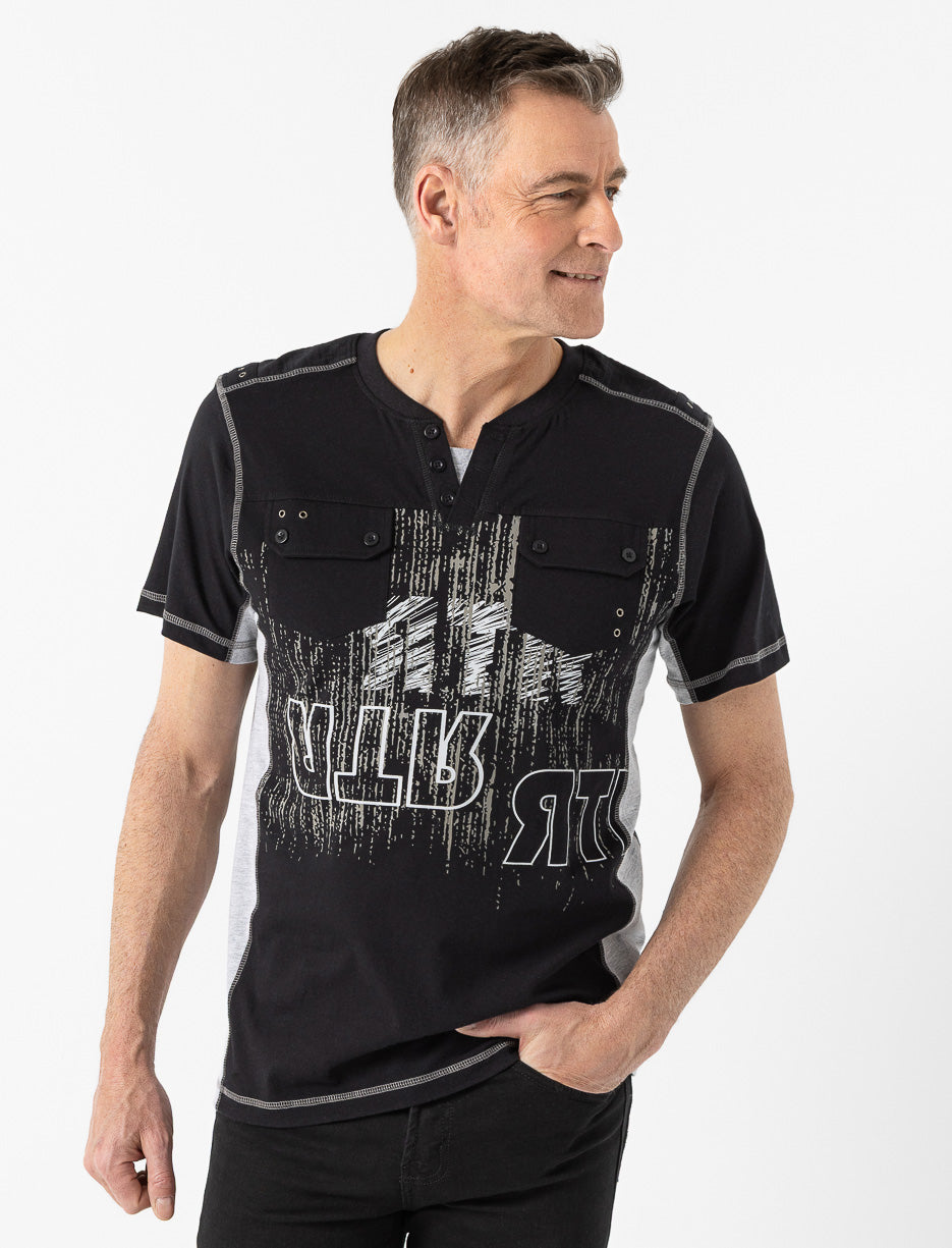Un imprimé audacieux et des détails boutonnés aux poches rehaussent ce t-shirt confortable. Idéal pour dynamiser une tenue décontractée avec une touche de caractère, sans compromettre le confort.