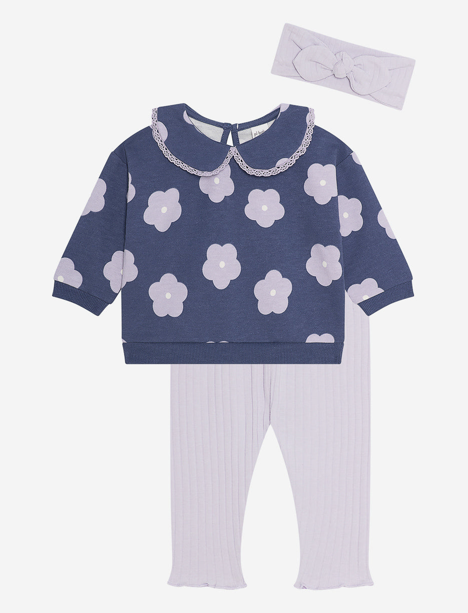 Habillez votre petite avec douceur grâce à cet ensemble 2 pièces. Chandail col claudine à œillets et imprimé intégral, legging uni à taille élastique et bandeau assorti pour compléter le look avec charme.