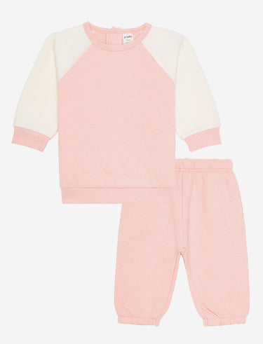 Craquez pour ce doux ensemble 2 pièces, composé d’un chandail et d’un pantalon matelassés de petits cœurs, pour un confort irrésistible et un style tendre au quotidien.