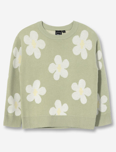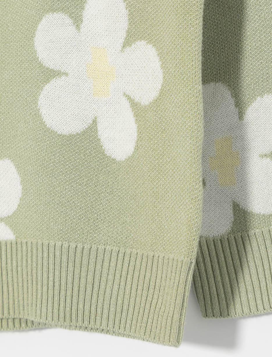 Un chandail en tricot doux à manches longues et épaules tombantes. Son col rond et ses fleurs délicates ajoutent une touche de charme aux journées fraîches.