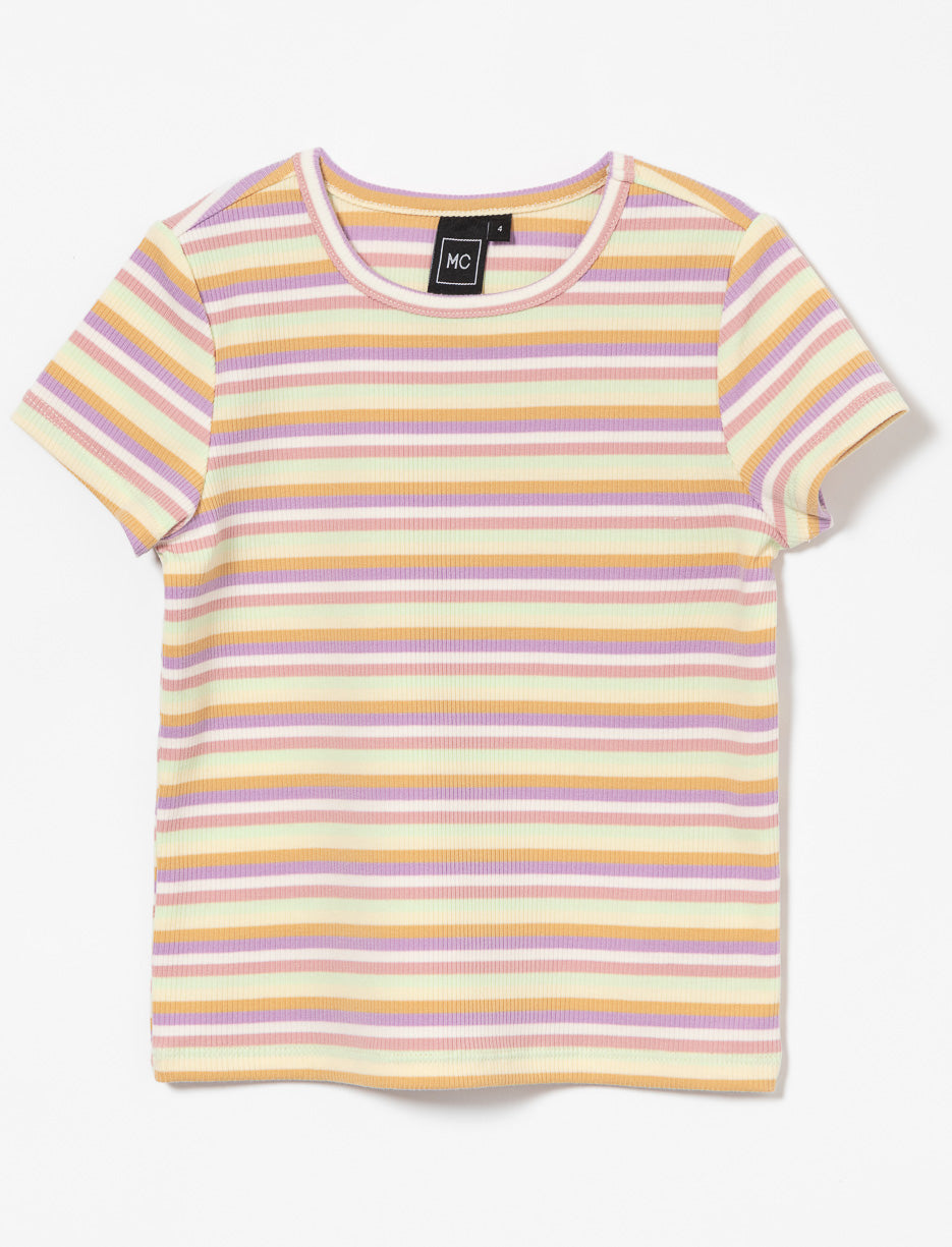 Un essentiel joyeux pour l’été ! Ce t-shirt côtelé à rayures pastel apportera une touche vitaminée aux tenues de votre petite.