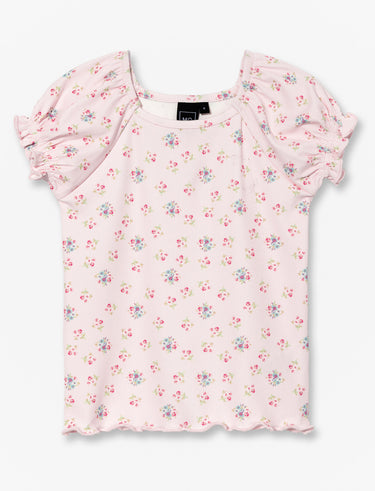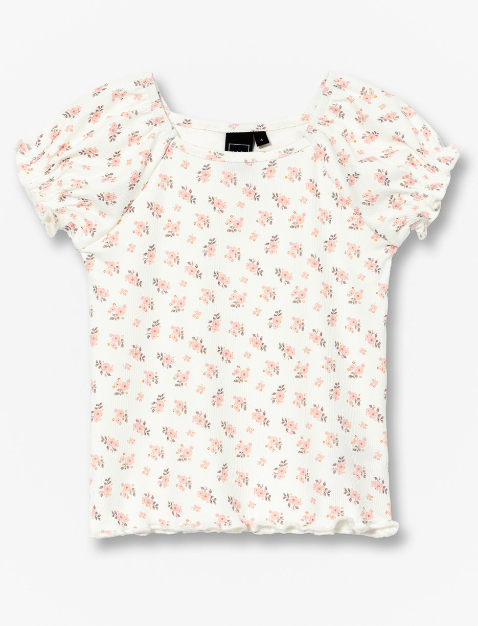 Ce t-shirt ajusté pour petite fille offre confort et style avec ses manches courtes en nid d'abeille et son encolure dégagée. Le motif fleuri sur l'ensemble et les bordures en laitue aux manches et au bas ajoutent une touche adorable et tendance.