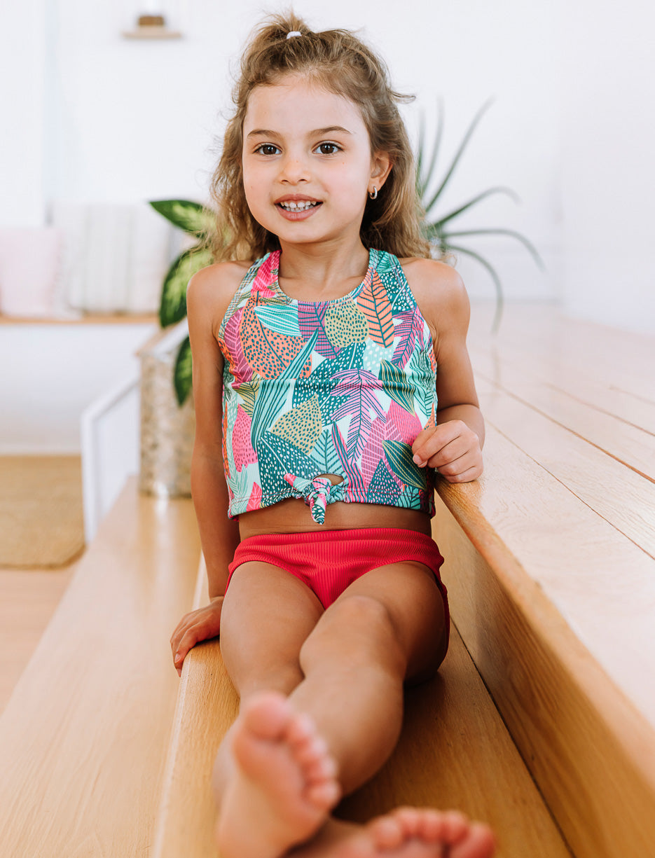 Ajoutez une touche ludique à la garde-robe de plage de votre petite avec ce maillot 2 pièces. Le haut à larges bretelles se noue à l’avant pour un style charmant, tandis que le bas assorti assure un ajustement confortable pour jouer librement.