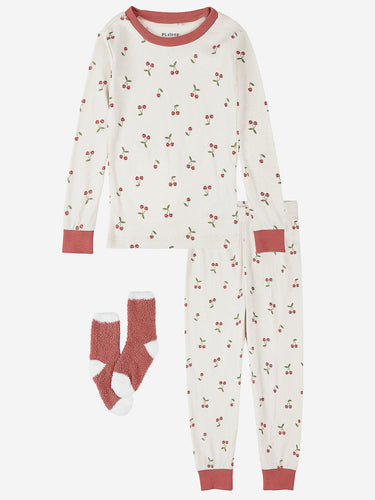 Offrez à votre enfant des nuits confortables avec ce pyjama 2 pièces à imprimé cerises, doté de poignets et chevilles côtelés, accompagné de bas doux pour un ensemble douillet.