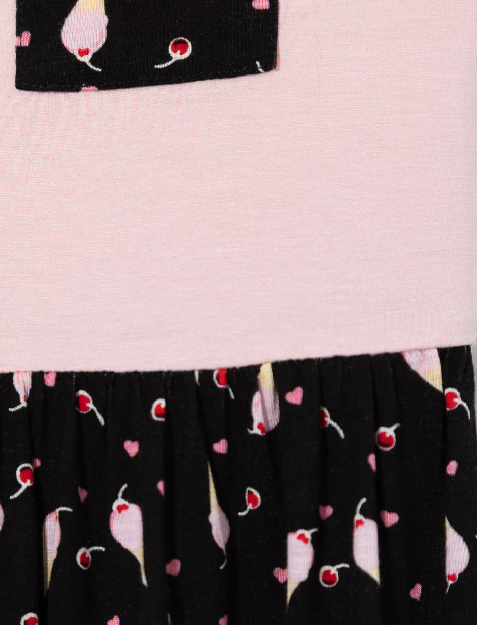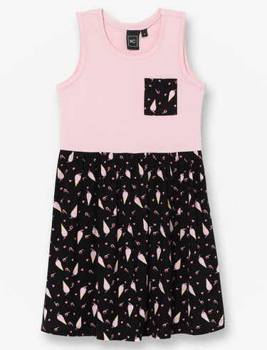 Robe sans manches cintrée à la taille avec col rond et jupe évasée. Modèle deux tons avec haut uni, poche contrastante imprimée et bas à motif de cornets sur l’ensemble. Légère et amusante, parfaite pour la saison estivale.
