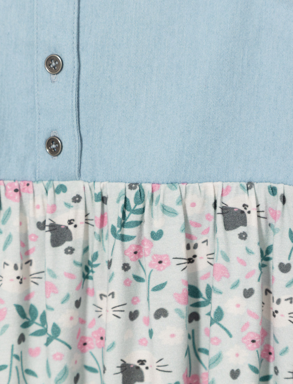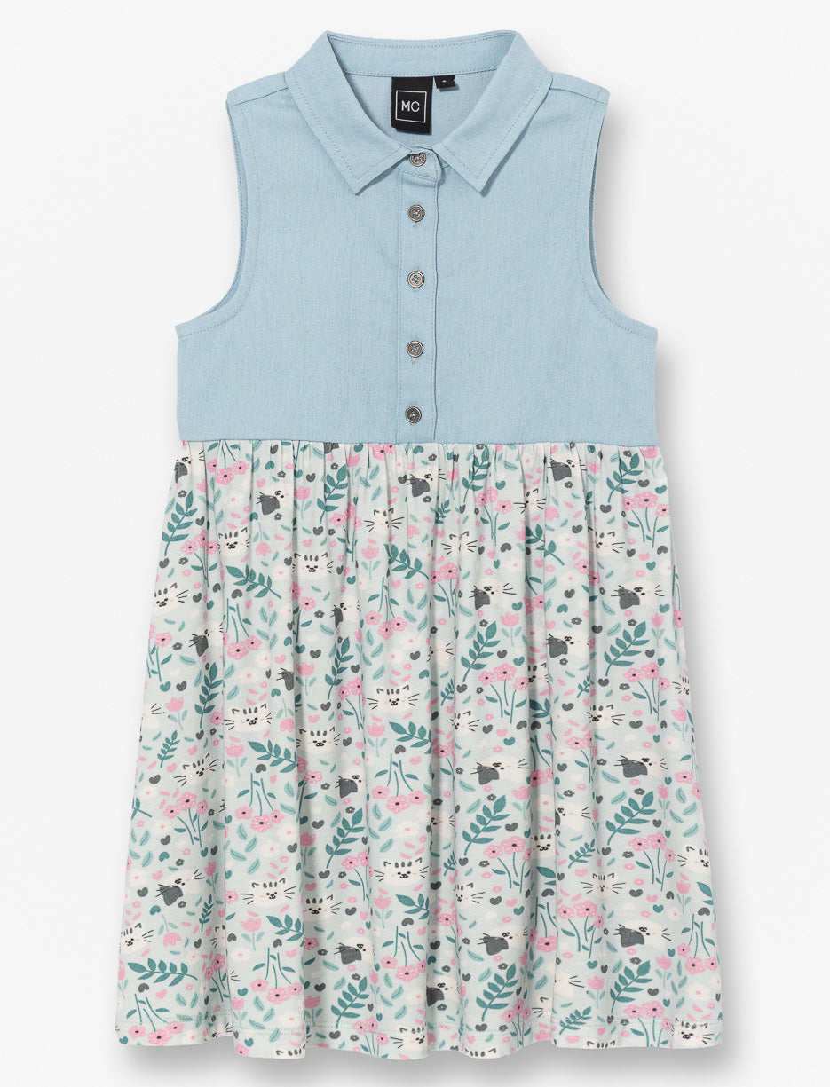 Robe sans manches au col chemisier intemporel. Le haut en chambrai structuré contraste élégamment avec le bas évasé orné d'un motif floral délicat. Fermeture boutonnière et silhouette cintrée à la taille pour une allure féminine et raffinée.