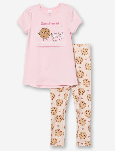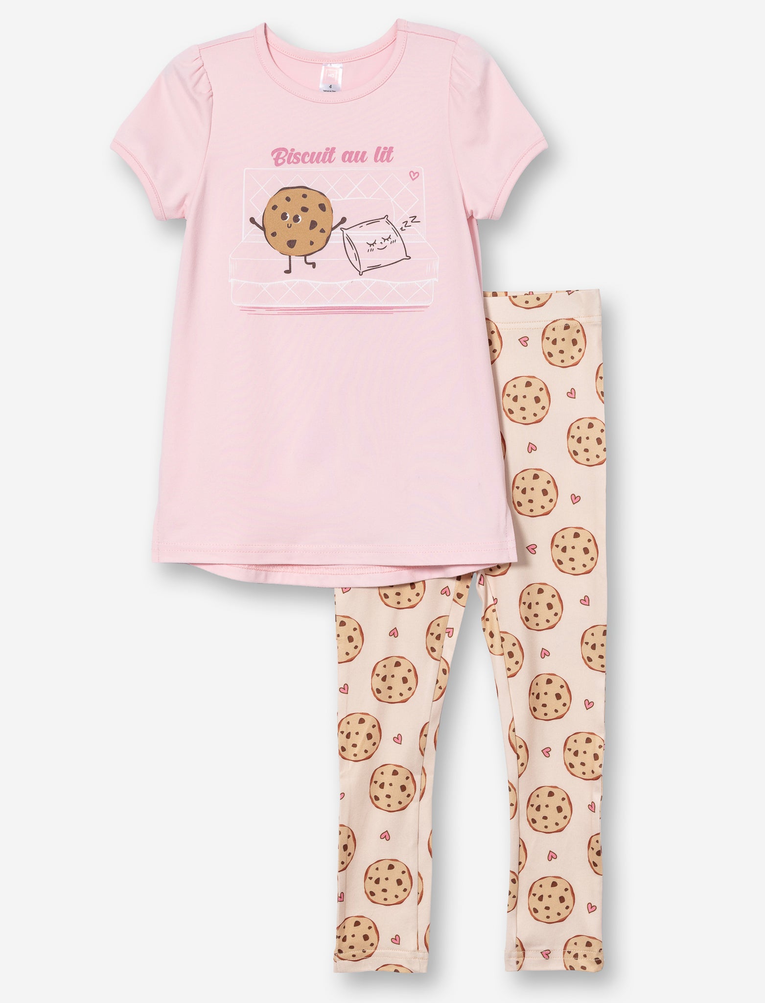Ensemble pyjama 2 pièces confortable et élégant. T-shirt tunique à manches courtes avec col rond et imprimé devant. Pantalon à taille élastique et jambe droite. Motif biscuit sur l'ensemble pour un style cohérent et intemporel. Parfait pour des nuits douces et relaxantes.