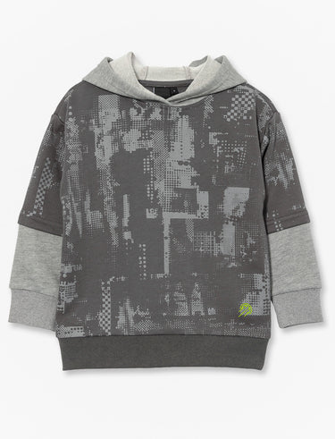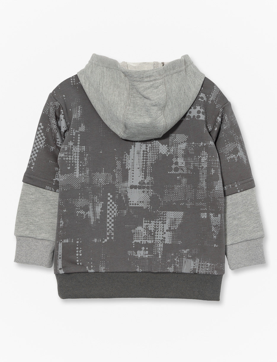 Ce chandail ouaté à capuchon est le compagnon idéal des petits garçons! Manches longues superposées, motif ludique sur l'ensemble. Parfait pour jouer et s'amuser en toute aisance.