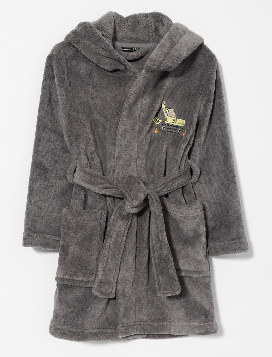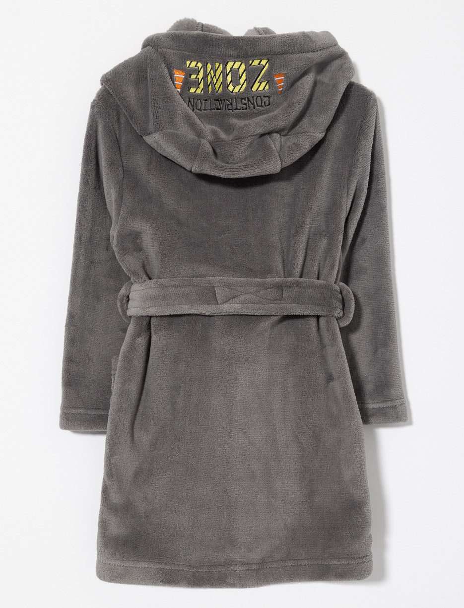 Une robe de chambre en peluche douce et chaude, avec capuchon, ceinture et poches pratiques, idéale pour envelopper votre garçon de confort.