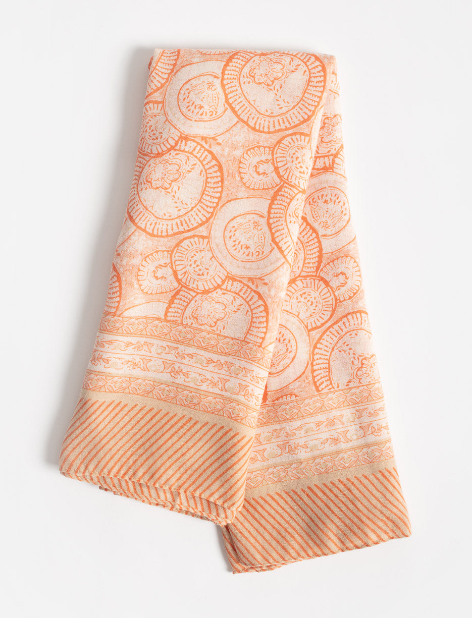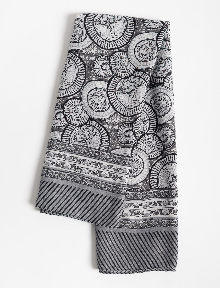 Enveloppez-vous de style avec ce foulard de transition aux formes circulaires harmonieuses et sa bordure imprimée distinctive. Un accessoire polyvalent qui accompagne vos changements de saison avec élégance et confort.