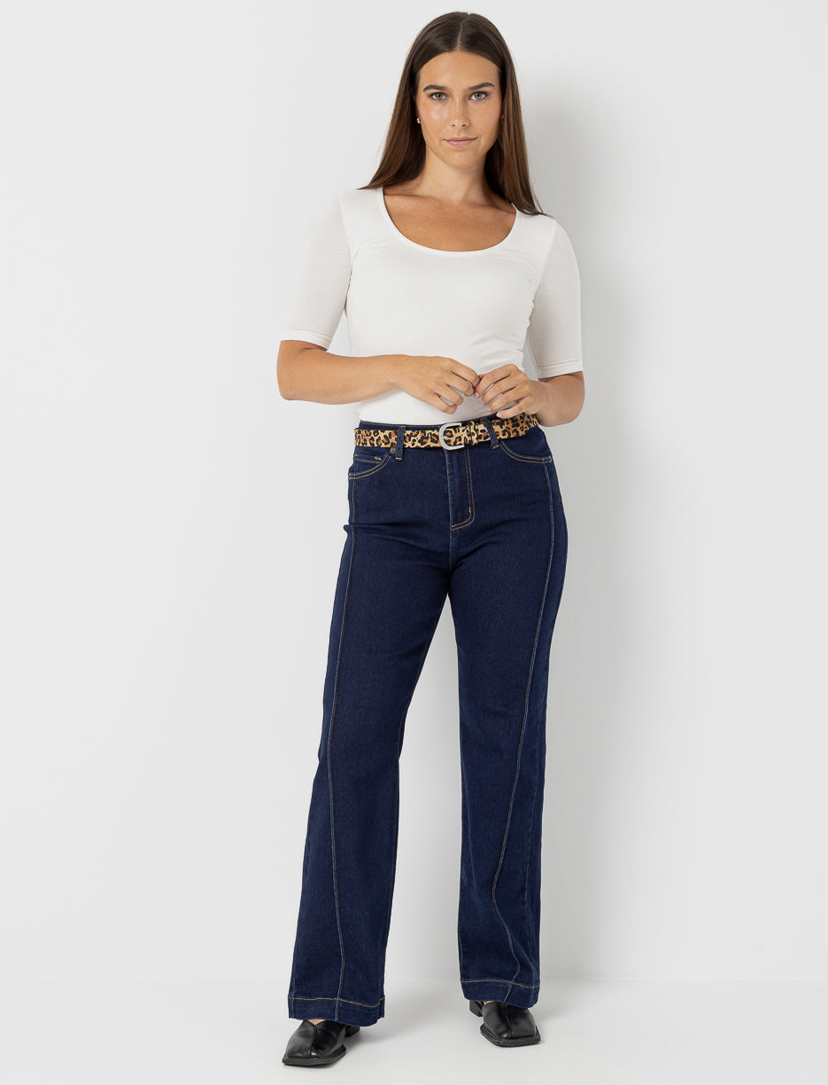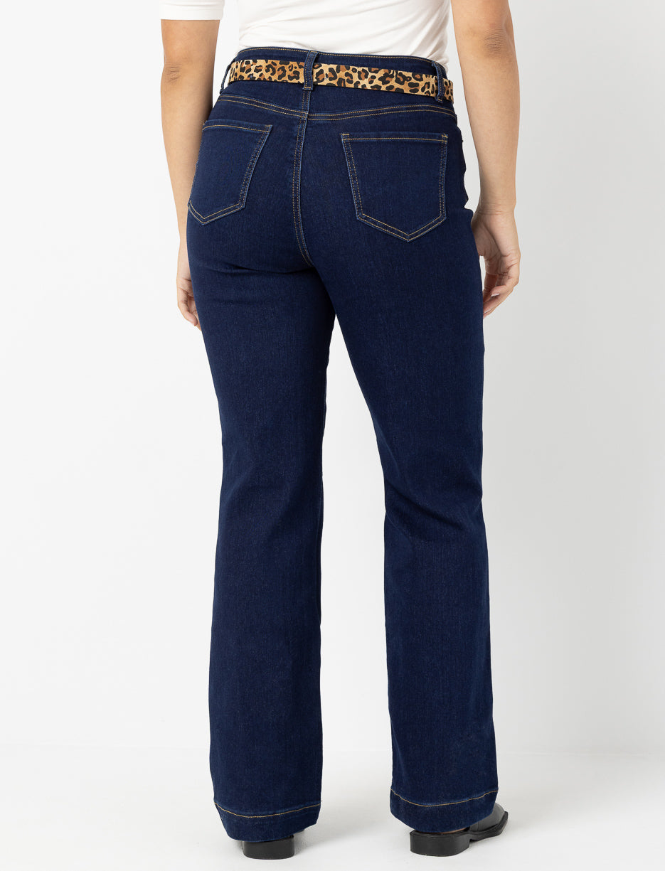Adoptez un style décontracté et élégant avec ce jean à jambes larges, rehaussé d’une ceinture tendance pour une touche finale affirmée.