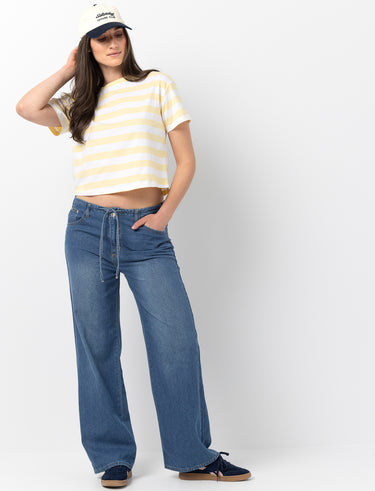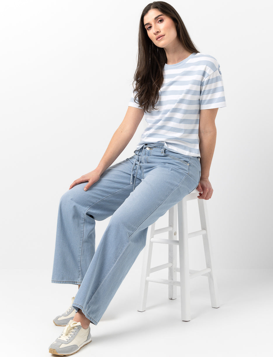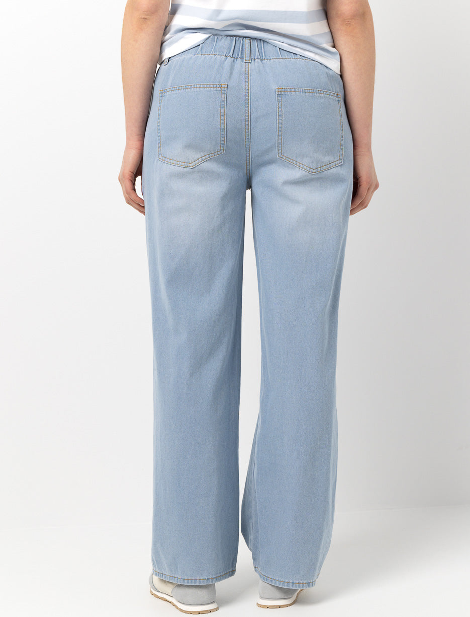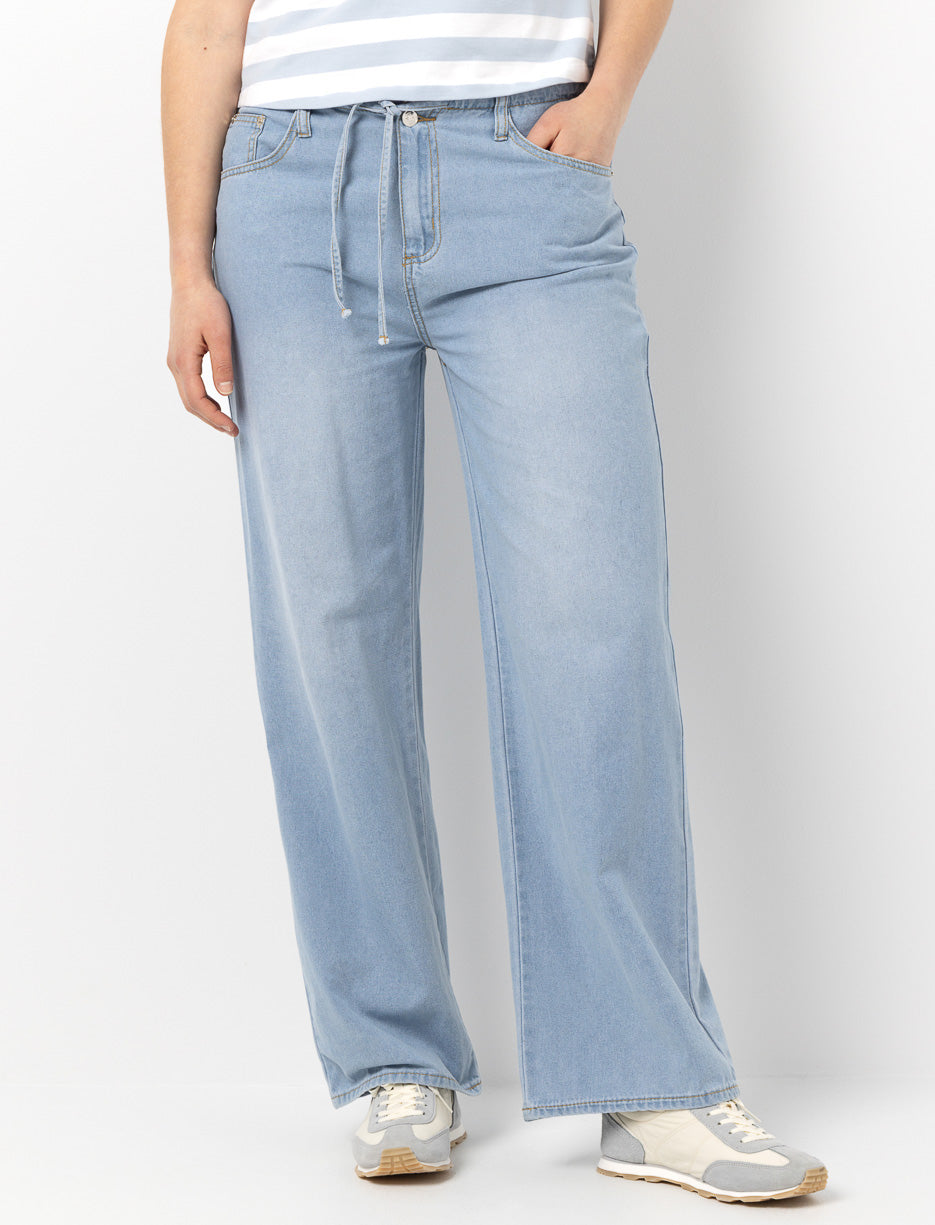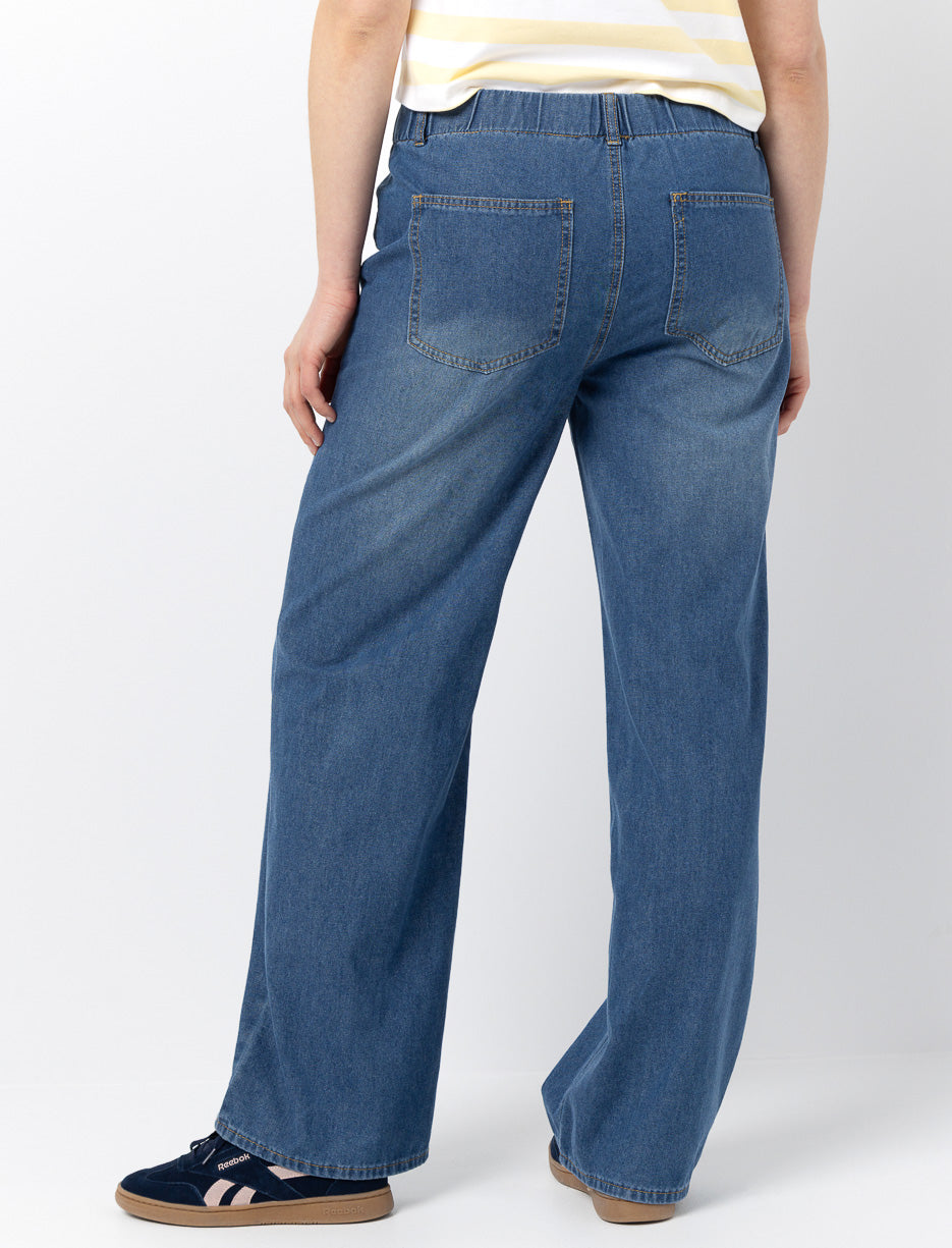 Jean pour femme confectionné en denim léger et respirant avec une coupe jambe large flatteuse. Cinq poches pratiques pour ranger vos essentiels, tandis que la ceinture élastiquée au dos assure confort et soutien toute la journée.