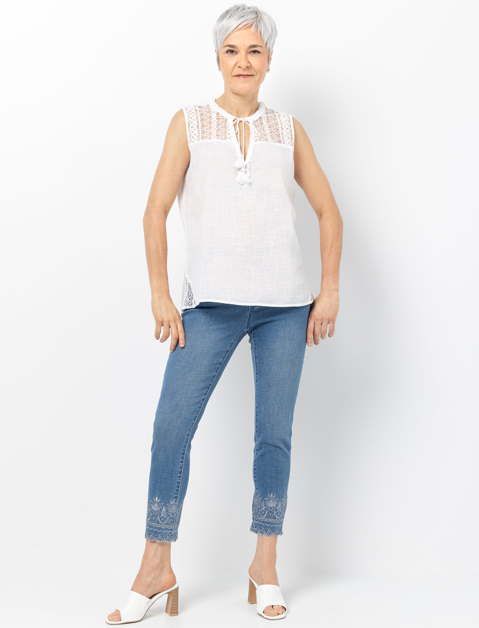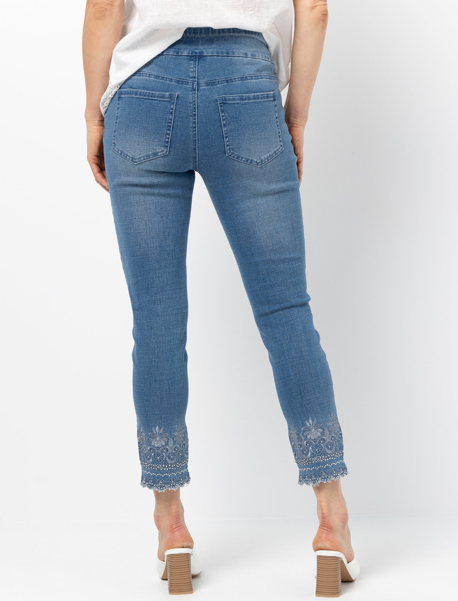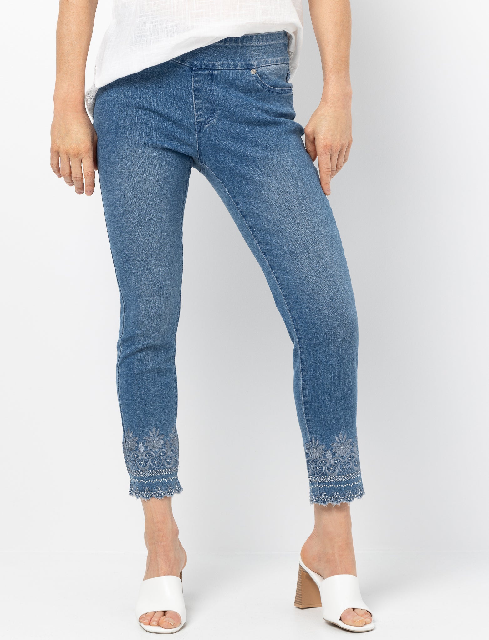Jean court à jambe droite avec coupe classique et confortable. Doté de 5 poches pratiques et d'une taille élastiquée pour un enfilage facile. Les détails de broderie délicate et la finition festonnée au bas ajoutent une touche élégante et féminine. Un incontournable polyvalent pour votre garde-robe.