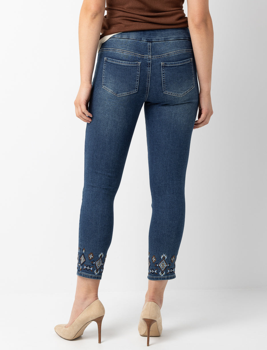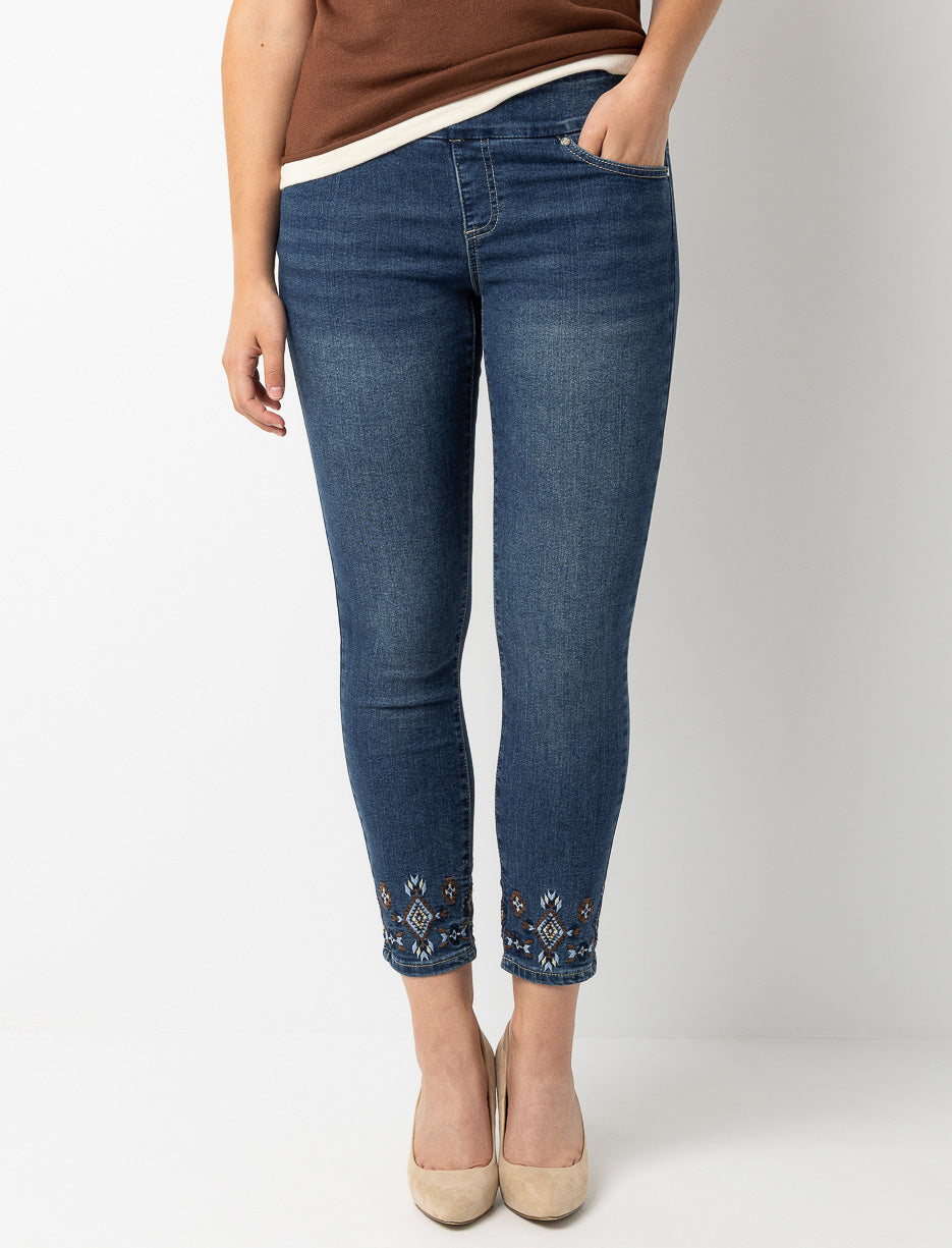 Un bas de jambe orné de broderies délicates qui attire discrètement l’œil. Ce jean droit allie simplicité et détails soignés pour un style confortable et actuel.