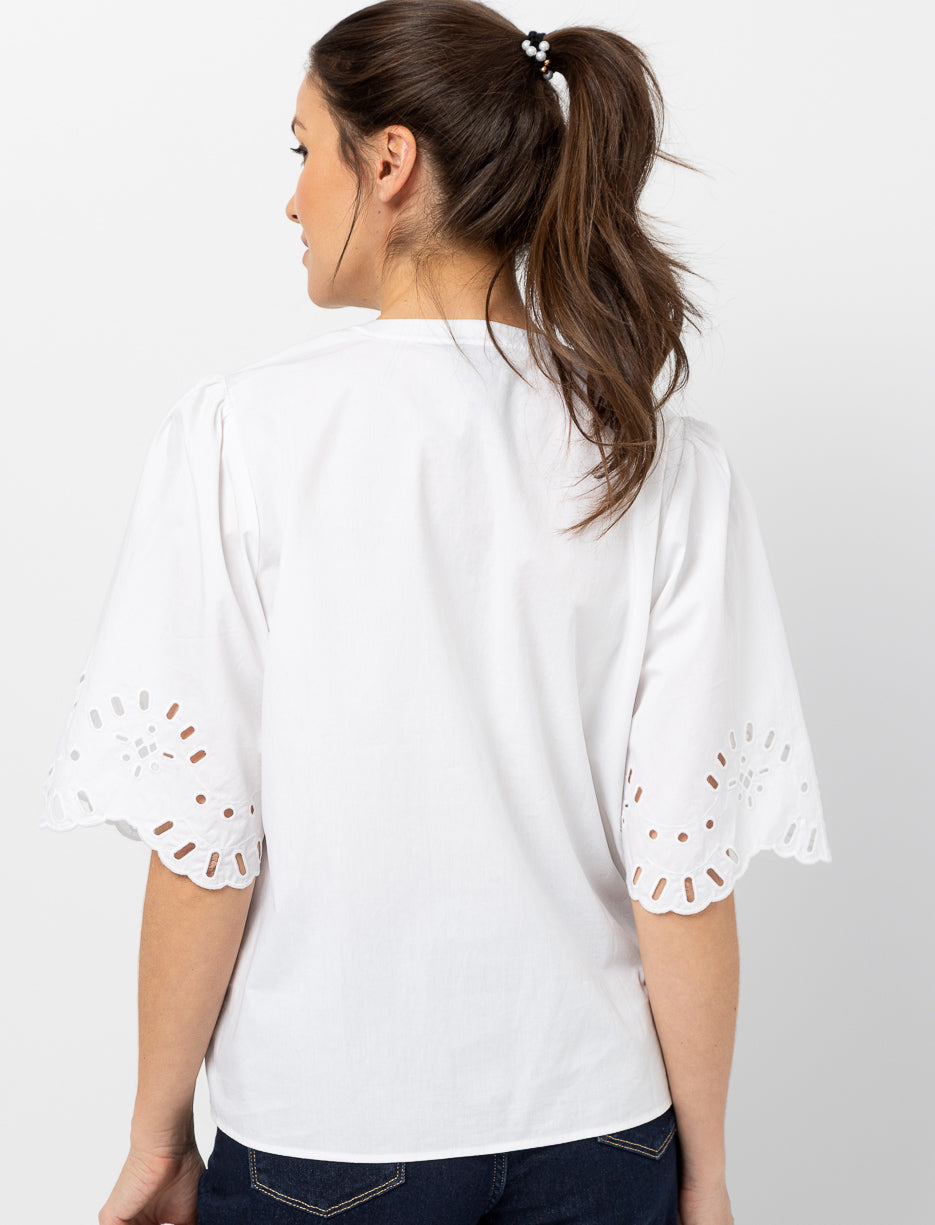 Blouse à col rond, dotée de manches courtes bouffantes délicatement ajourées. Une pièce élégante et féminine, idéale pour un look chic et moderne.
