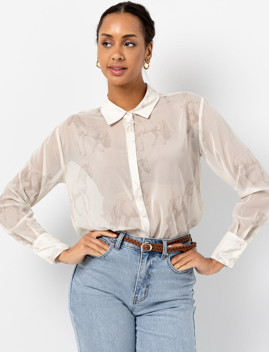 Laissez-vous charmer par cette chemise boutonnée légère ornée d’un imprimé cheval discret. Avec son tissu transparent et son col classique, elle offre une touche d'élégance et de douceur à votre tenue.