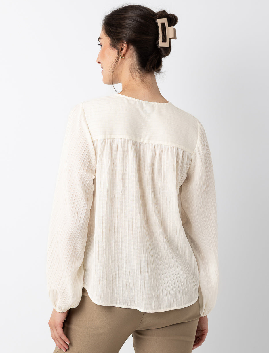 Apportez une touche de douceur à votre tenue avec cette blouse boutonnée à col rond. Ses manches longues bouffantes ajoutent un volume délicat, tandis que la coupe fluide assure un confort élégant toute la journée.