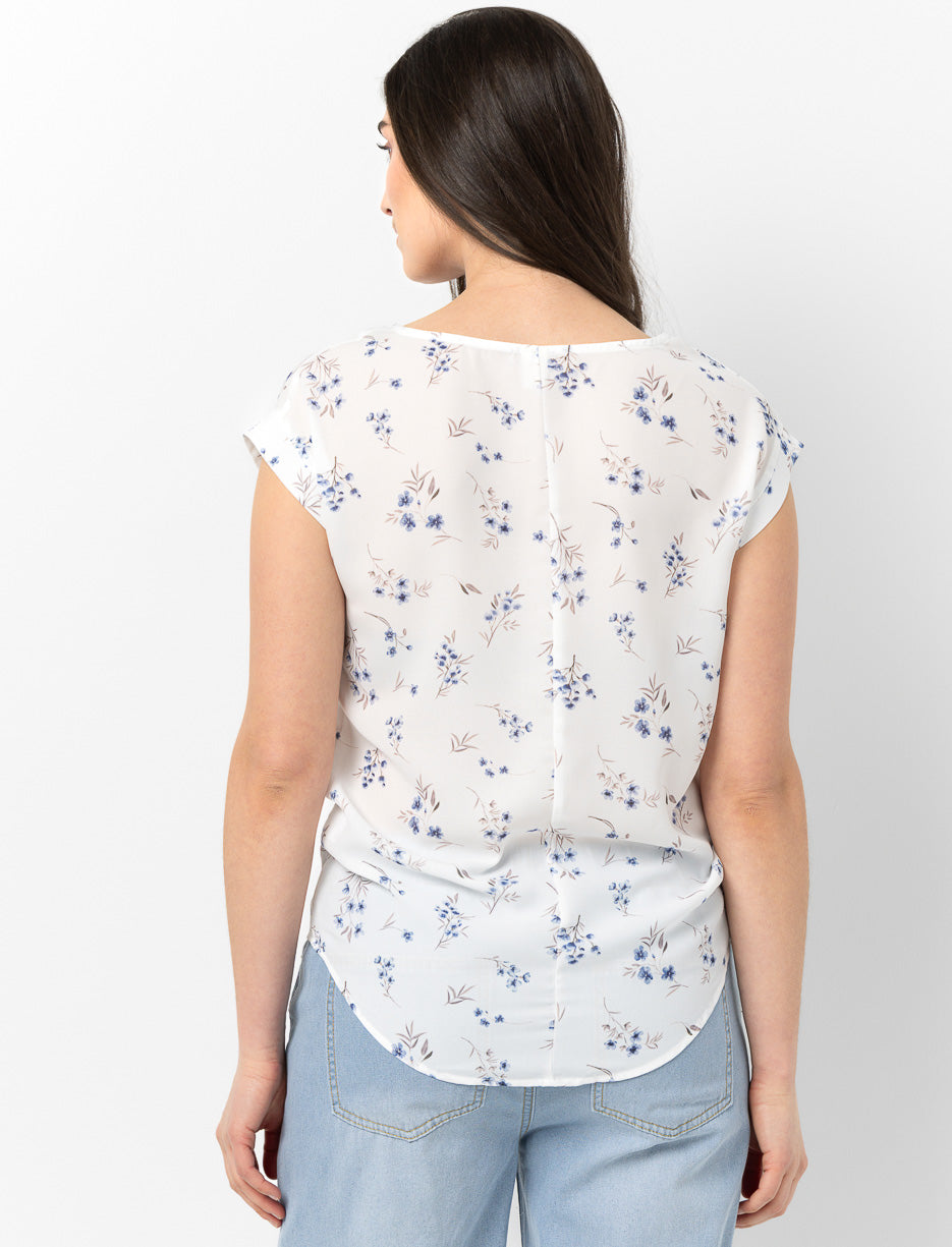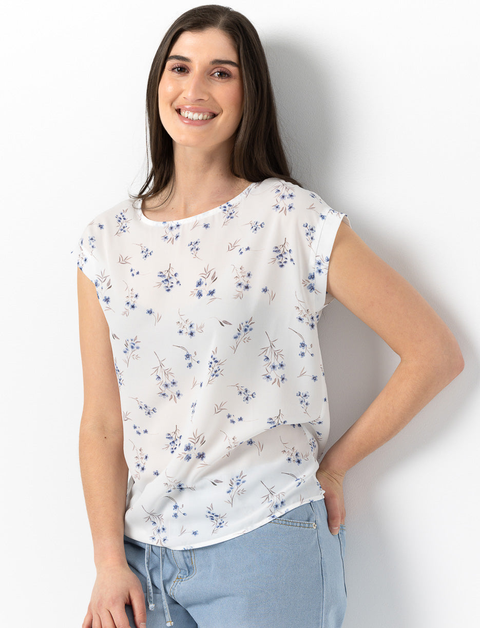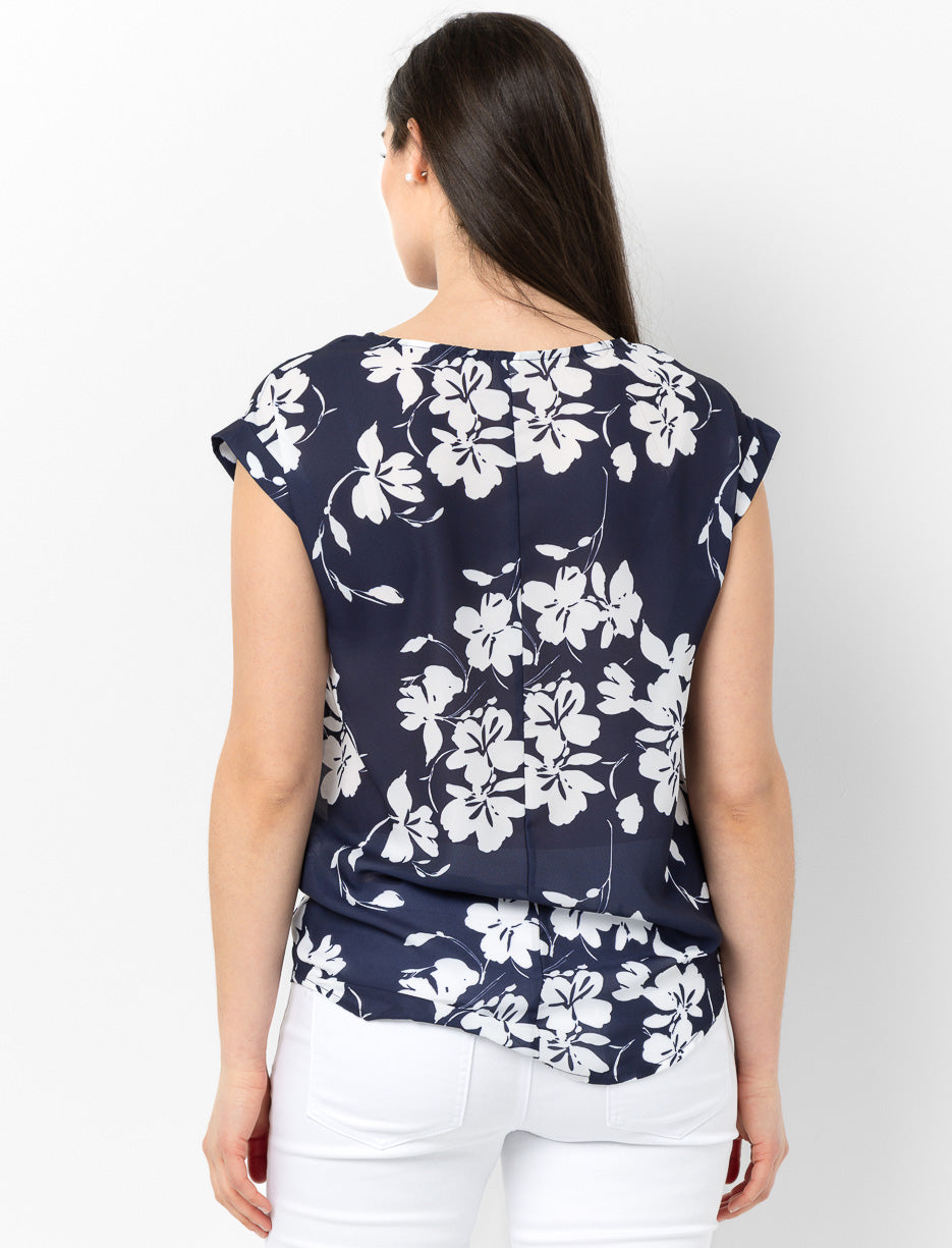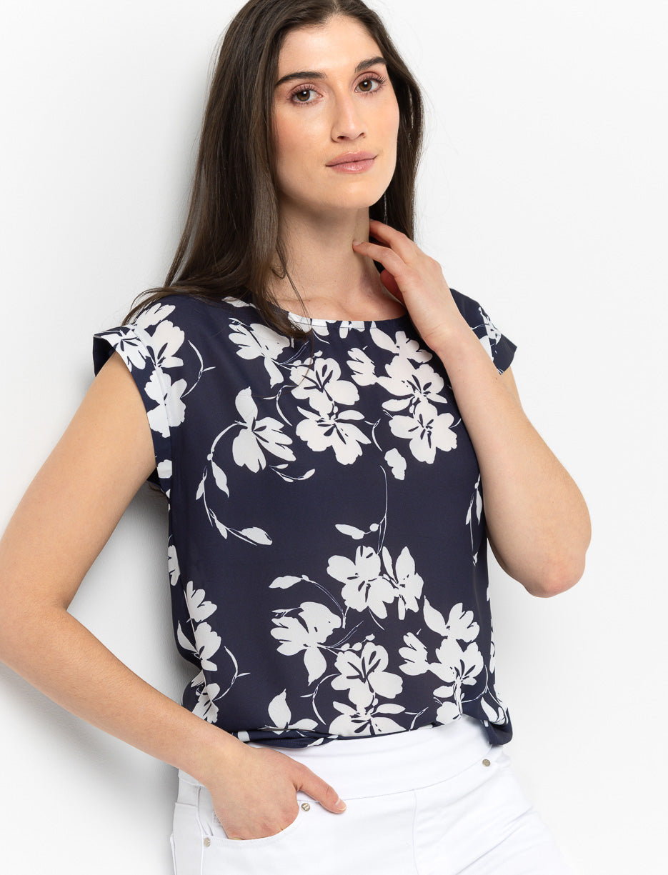 Élégante blouse en crêpe pour femme, dotée de manches courtes et fluides avec revers. Son encolure ronde et son motif floral intemporel en font une pièce indispensable, à la fois chic et confortable pour tous vos moments.