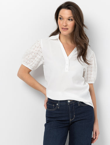 Blouse épurée pour femme dotée d'un col chemisier classique et intemporel. Les manches courtes ajourées et délicates ajoutent une touche de raffinement à votre tenue. Parfaite pour créer des looks simples et élégants, cette pièce s'adapte facilement à vos styles du quotidien comme à vos occasions spéciales.