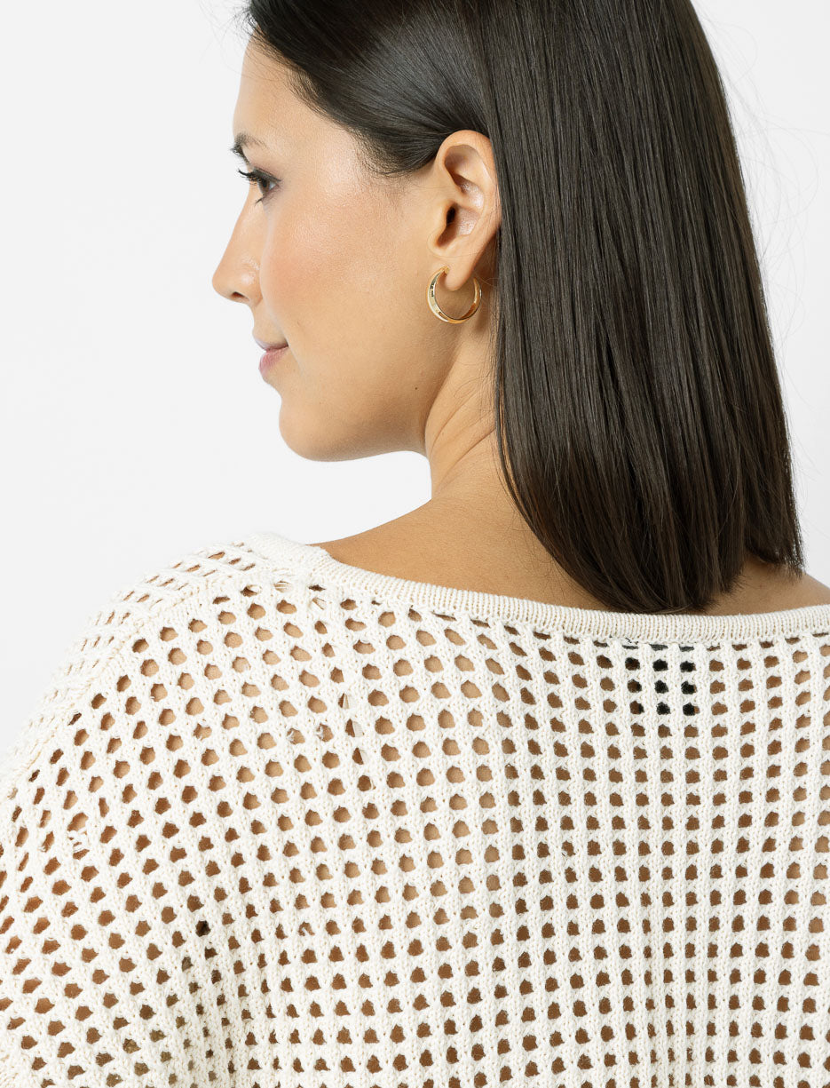 Un chandail en tricot ajouré au style décontracté et tendance, parfait pour ajouter une touche légère et moderne à vos tenues.