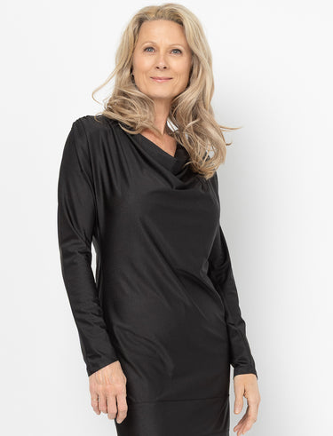 Élégante et fluide, cette tunique à col drapé vous assure une allure chic sans effort. Son tissu lustré et sa coupe flatteuse en font la pièce parfaite pour briller lors de vos soirées.