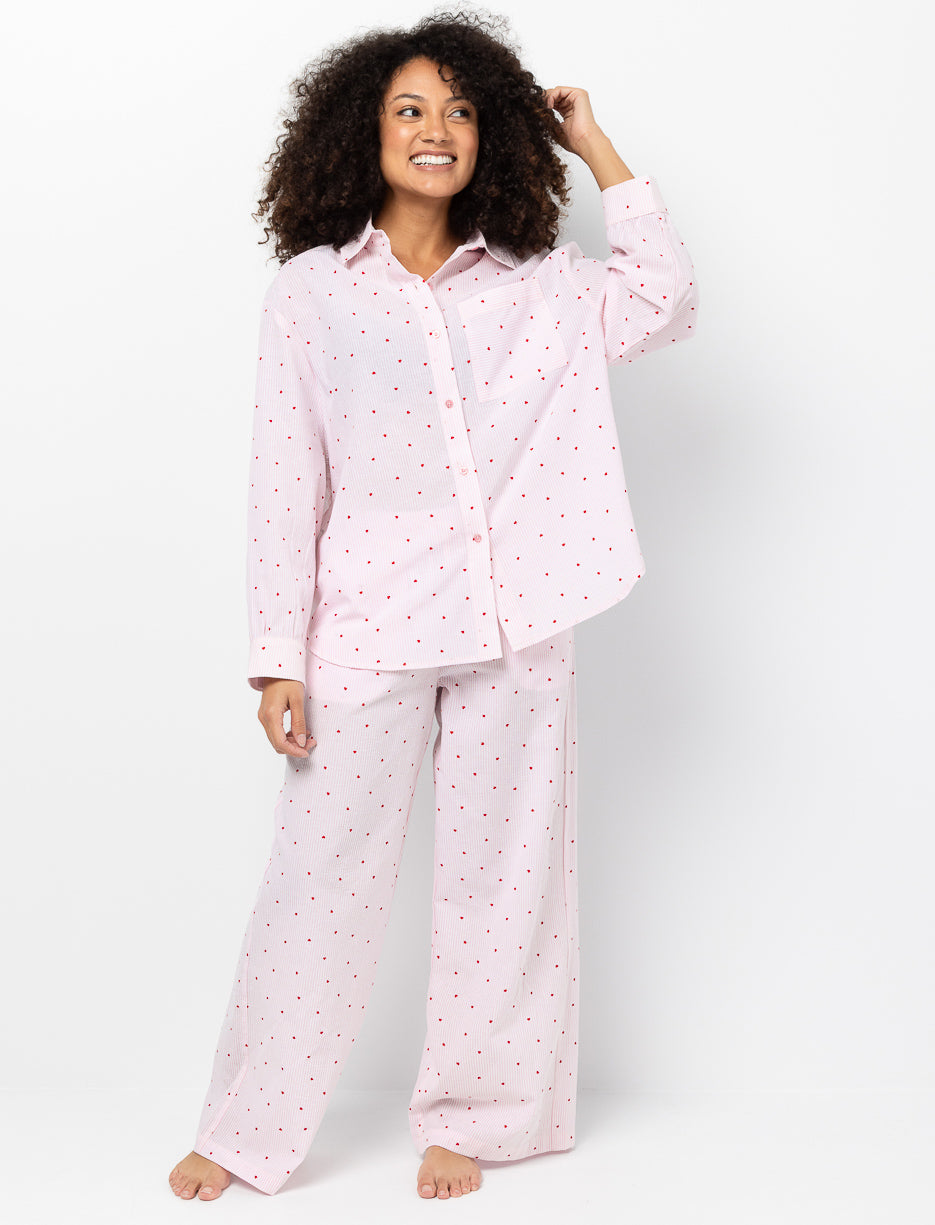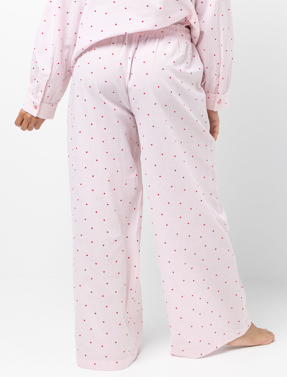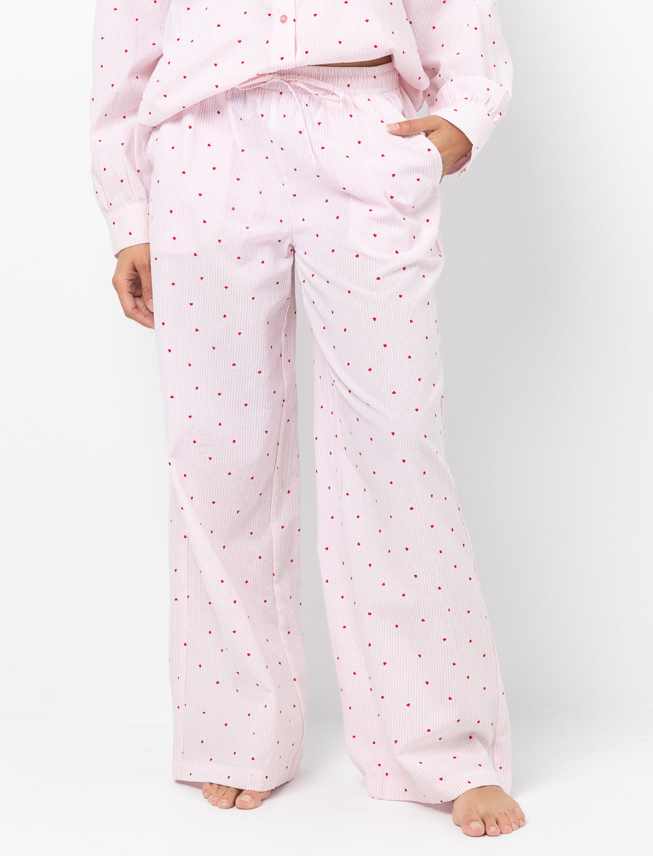 Un pantalon de pyjama pensé pour les moments de détente. La taille élastique avec cordon et les poches latérales offrent un porté facile, tandis que les fines rayures et les petits cœurs ajoutent une touche délicate.