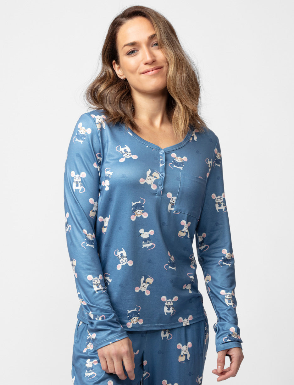 Glissez-vous dans une nuit de rêves avec ce haut de pyjama à manches longues et douillet, orné d'un charmant motif de souris.
