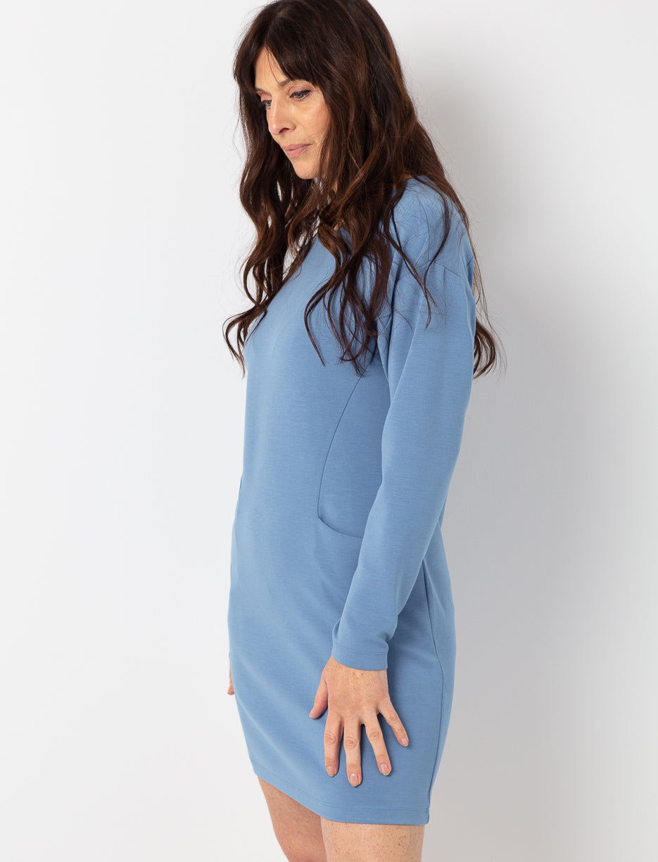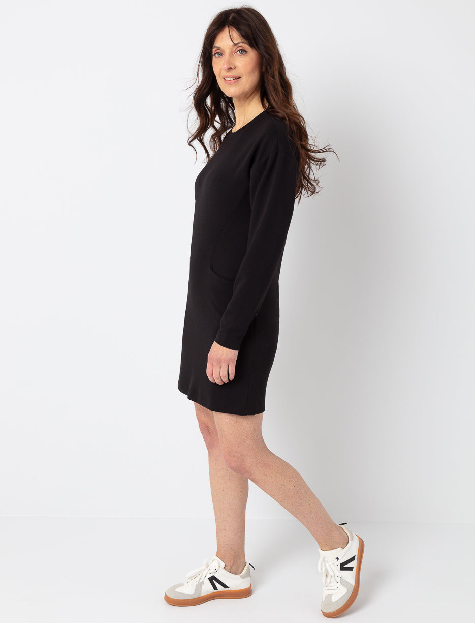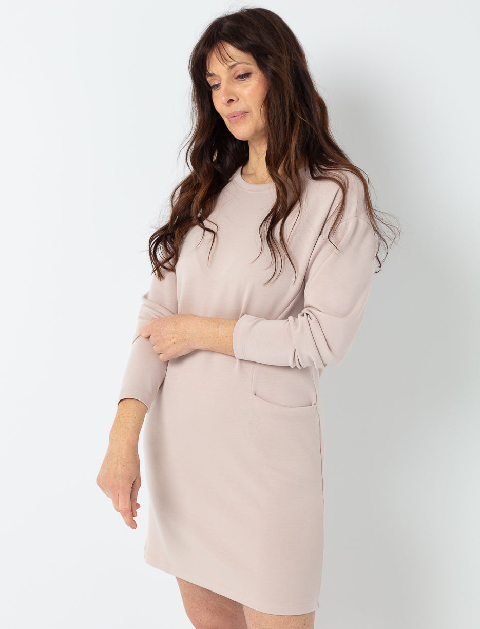 Épurée et élégante, cette robe allie confort et modernité. Son tissu doux et extensible épouse la silhouette avec fluidité, tandis que sa coupe décontractée et ses poches discrètes ajoutent une touche pratique.