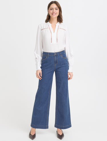 Ce jean à taille haute mise sur une jambe large pour une allure actuelle et décontractée. Sa coupe flatte la silhouette et se porte facilement avec une blouse ou un haut ajusté, du quotidien aux sorties.