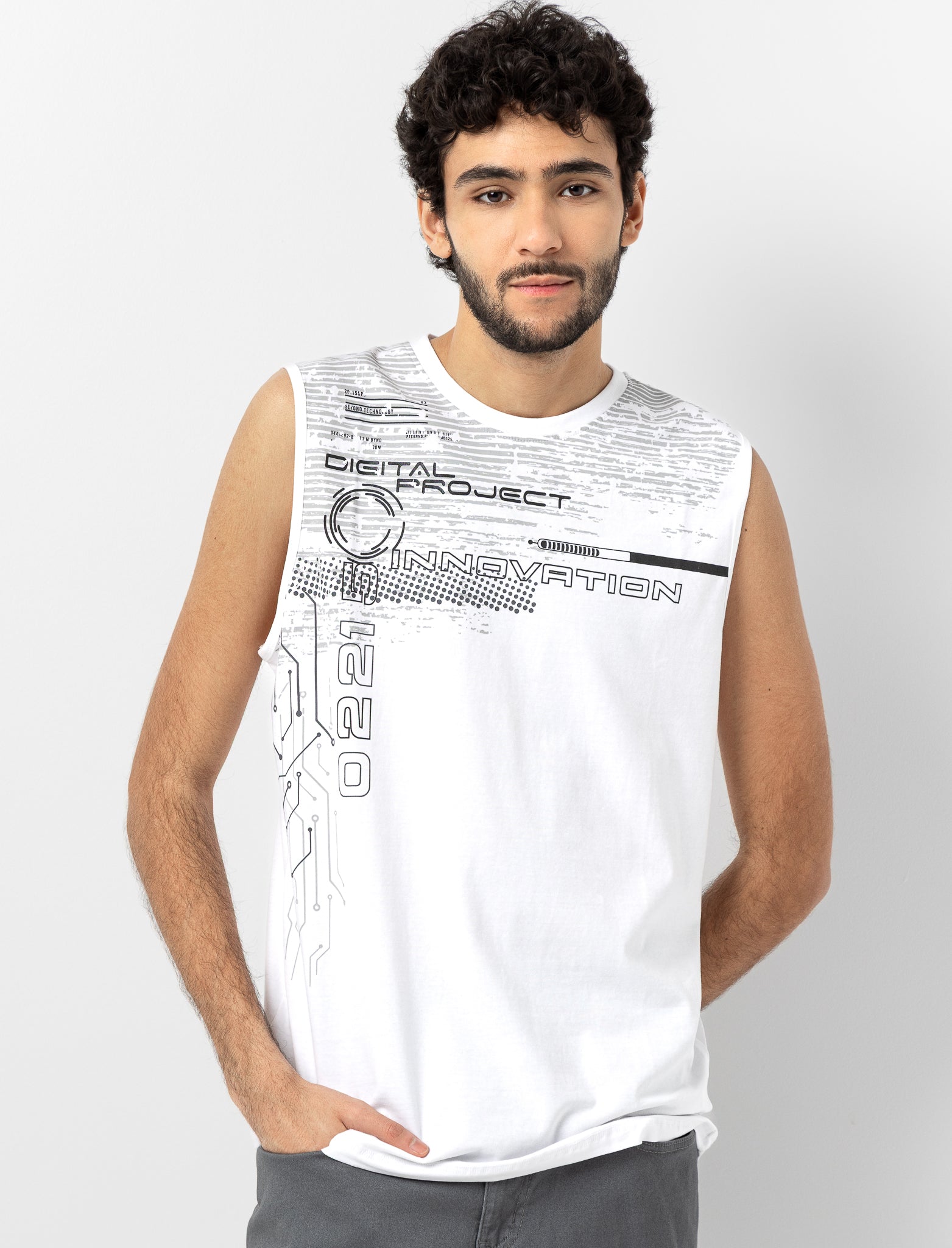 Camisole classique à col rond et sans manches, dotée d'un imprimé élégant sur le devant. Parfaite pour les tenues décontractées ou comme pièce de base polyvalente à superposer. Confortable et intemporelle, elle s'adapte à tous les styles et saisons.
