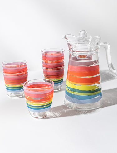 Ensemble pichet et 6 verres à rayures colorées