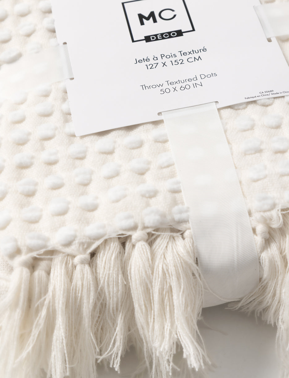 Ajoutez une touche chaleureuse à votre décor avec ce jeté texturé orné de franges. Parfait pour rehausser un canapé ou créer une ambiance douce et accueillante dans votre espace. Dimensions : 50 x 60 po.