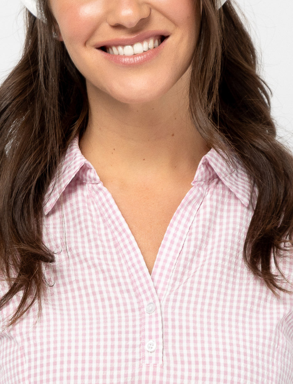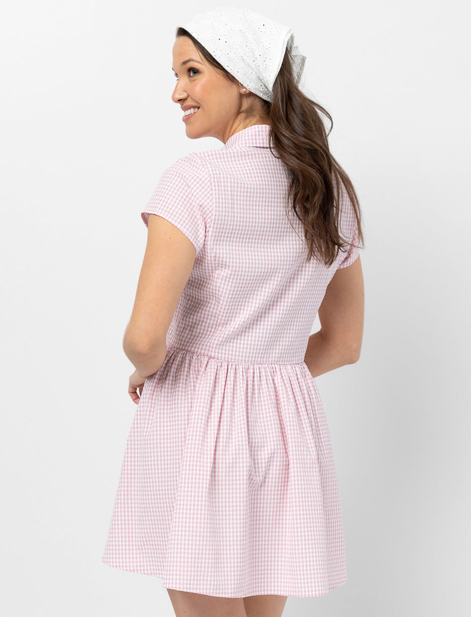 Sublimez votre silhouette avec cette robe au design raffiné. Ajustée à la taille et évasée aux hanches, elle offre une allure gracieuse et féminine. Le col chemisier avec boutons, les manches courtes et la taille basque froncée apportent du style. Le motif gingham intemporel en fait une pièce élégante et polyvalente.