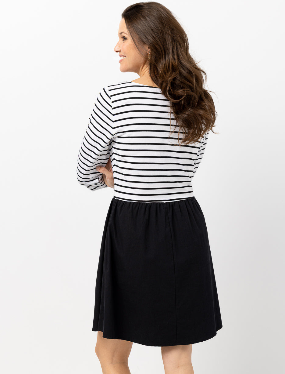 Avec son col bateau élégant, son haut rayé et sa jupe unie évasée, cette robe crée un look flatteur qui reste simple et moderne. Une pièce facile à porter qui donne du style sans effort.