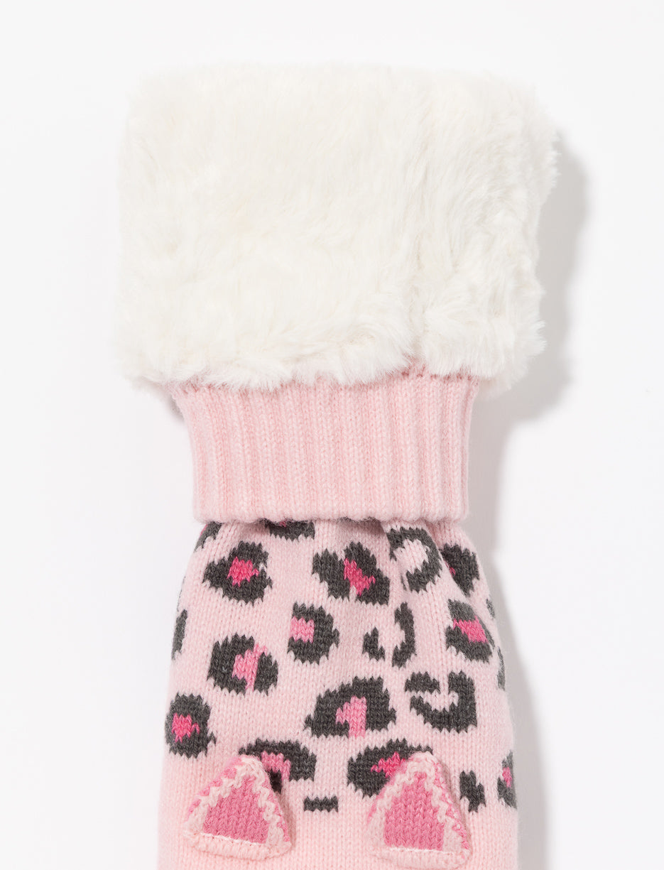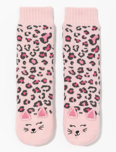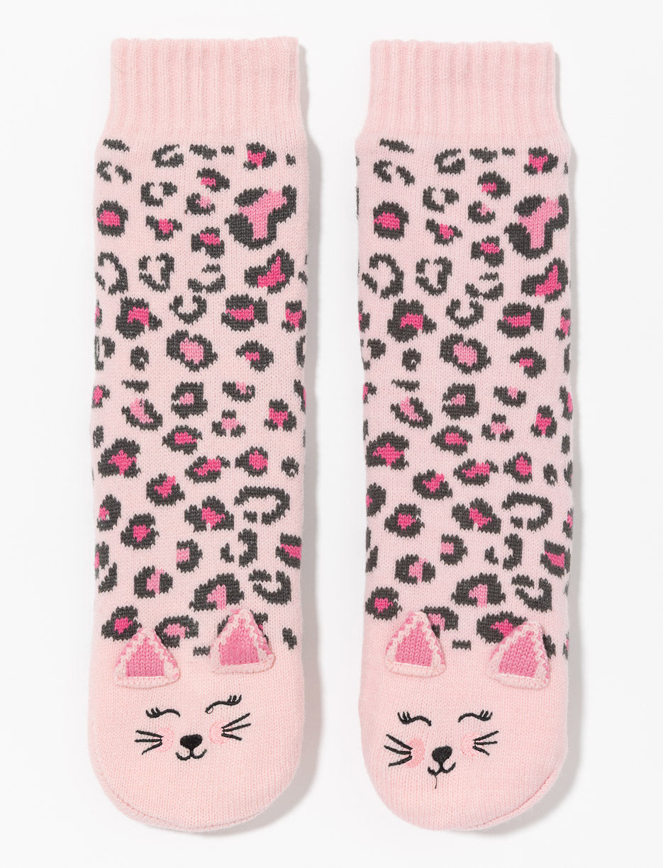 Soft and playful, these slipper socks feature a cute cat face and leopard print. Perfect for keeping your feet warm with an extra touch of charm.